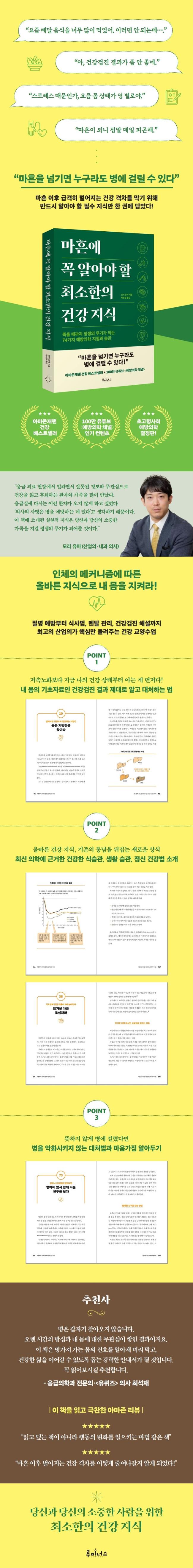 °Ç°¿¡ °¡Àå Å« µ¶¾àÀº ¹«Áö¿Í ¹«°ü½ÉÀÌ´Ù. °Ç°ÀÇ º¯°îÁ¡À» Áö³ª´Â ³ªÀÌ ¸¶ÈçÀÌ µÇ¸é À§±âÀǽÄÀ» °¡Áö°í Áúº´ ¿¹¹æ°ú Á¶±â ¹ß°ß, Ä¡·á¸¦ À§ÇÑ ÀçȰÀ» ÁغñÇØ¾ß ÇÑ´Ù. °Ç°Àº Àý´ë ±×³É ÁÖ¾îÁö´Â °Ô ¾Æ´Ï´Ù. ÀÌ Ã¥Àº ÀÎüÀÇ ¸ÞÄ¿´ÏÁò¿¡ µû¸¥ ¿Ã¹Ù¸¥ Áö½ÄÀ¸·Î ³» ¸öÀ» Áöų ¼ö ÀÖ´Â ¹æ¹ýÀ» ¾Ë·ÁÁØ´Ù. ÁßÀå³â»Ó ¾Æ´Ï¶ó ºÎ¸ð ¼¼´ë¿¡µµ µµ¿òµÉ À¯¿ëÇÑ Á¤º¸°¡ ¸¹´Ù. ³ªÀÌ µé¼ö·Ï ´õ Áß¿äÇÏ°Ô ¿©°ÜÁö´Â ¡®°Ç°¼ö¸í¡¯À» ¿¬ÀåÇÏ´Â ¹æ¹ýÀ» ºñ·ÔÇØ À̸¦ À§ÇÑ ¿Ã¹Ù¸¥ »ýȰ ½À°ü°ú ½Ä½À°ü µî¿¡ °üÇØ¼µµ ±íÀÌ ÀÖ°Ô ´Ù·é´Ù. 40´ë ÀÚ³à¿Í ³ëÈĸ¦ ´ëºñÇÏ´Â ºÎ¸ð°¡ ÇÔ²² ÀÐÀ¸¸é ÁÁÀº °Ç° ±³¾ç¼ÀÌ´Ù.