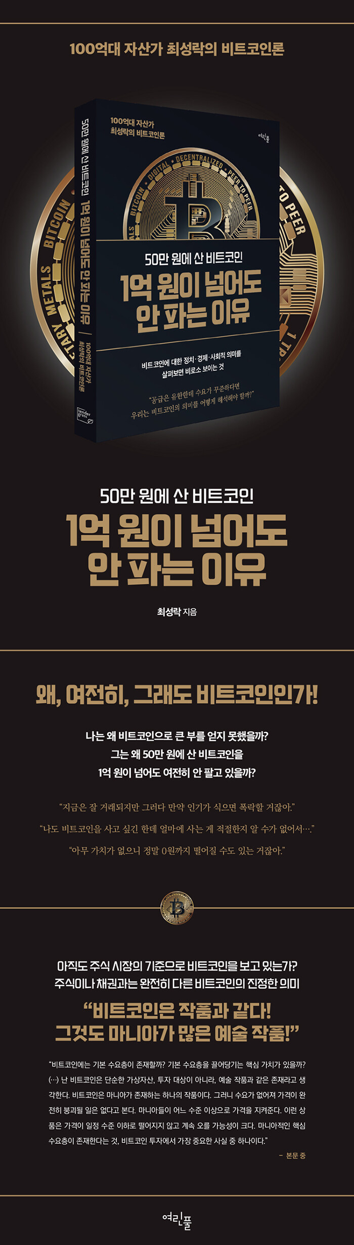 ÀúÀÚ´Â ¸»ÇÑ´Ù. ¡°ºñÆ®ÄÚÀÎÀÌ ÅÂ¾î³ Áö 15³âÀÌ ³Ñ¾ú´Ù. ±×µ¿¾È »ç¶÷µéÀº ºñÆ®ÄÚÀο¡ ´ëÇØ ¿©·¯ À̾߱⸦ µè°í ÆÇ´ÜÇØ¿Ô´Ù. ÇÏÁö¸¸ ±× ´ëºÎºÐÀÇ ÆÇ´ÜÀº Ʋ·È´Ù.¡± ±×·¡¼ Áö³ 10³â°£ ºñÆ®ÄÚÀÎÀÇ °¡°ÝÀº 2¸¸% ÀÌ»ó »ó½ÂÇßÁö¸¸, Á¤ÀÛ ÀÌ ±âȸ¸¦ ÅëÇØ Å« ºÎ¸¦ ¾òÀº »ç¶÷Àº ¸¹Áö ¾Ê´Ù. ¡°»çȸÀûÀ¸·Îµç, ±â¼úÀûÀ¸·Îµç, °æÁ¦ÀûÀ¸·Îµç, ÅõÀÚÀûÀ¸·Îµç ºñÆ®ÄÚÀο¡ ´ëÇÑ ÆÇ´ÜÀÌ ¸Â¾Ò´Ù¸é, ±× »ç¶÷Àº Áö±Ý ÃÖ¼ÒÇÑ ¸Ô°í»ì °ÆÁ¤Àº ÇÏÁö ¾Ê´Â ºÎÀÚ°¡ µÇ¾úÀ» °ÍÀÌ´Ù. ¸îõ ¿ø, ¸î¸¸ ¿ø ÇÏ´ø °ÍÀÌ Áö±Ý 1¾ï ¿øÀÌ ³Ñ¾ú´Âµ¥, ÀÌ·¸°Ô ¿À¸¥ Á¾¸ñÀÌ ¹Ù·Î ¿·¿¡ ÀÖ¾ú´Âµ¥ ºÎÀÚ°¡ µÇÁö ¸øÇß´Ù´Â °Ç ¸»ÀÌ ¾È µÇÁö ¾ÊÀº°¡. Áö±Ý ºÎÀÚ°¡ µÇÁö ¸øÇß´Ù¸é ºñÆ®ÄÚÀο¡ ´ëÇÑ ÆÇ´Ü¿¡ ¿À·ù°¡ ÀÖ¾ú´Ù´Â °ÍÀ» ¸»ÇØÁØ´Ù.¡±