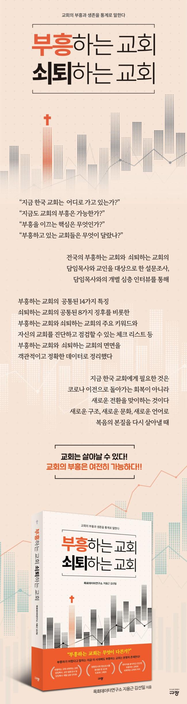 ¡°Áö±Ý Çѱ¹ ±³È¸´Â ¾îµð·Î °¡°í Àִ°¡?¡±¶ó´Â ½Ã´ëÀû ¹°À½¿¡¼ ½ÃÀÛµÈ ¡¶ºÎÈïÇÏ´Â ±³È¸ ¼èÅðÇÏ´Â ±³È¸¡·´Â Çѱ¹ ±³È¸ÀÇ ÇöÀ縦 Á¤È®È÷ Áø´ÜÇÏ¿© ºÎÈïÇÏ´Â ±³È¸¿Í ¼èÅðÇÏ´Â ±³È¸ÀÇ °£±ØÀ» Åë°èÀûÀ¸·Î ±Ô¸íÇÑ´Ù. ºÎÈïÇϱâ Á¤¸» ¾î·Á¿î ½Ã´ë¿¡µµ ºÎÈïÇÏ´Â ±³È¸´Â ¿©ÀüÈ÷ Á¸ÀçÇÑ´Ù. ÀÌ¿¡ ºÎÈïÇÏ´Â ±³È¸¿Í ¼èÅðÇÏ´Â ±³È¸, ¸ñȸÀÚ¿Í ¼ºµµ¸¦ Á¶»çÇÏ¿© ºÎÈïÇÏ´Â ±³È¸ÀÇ °øÅëµÈ 14°¡Áö Ư¡°ú ¼èÅðÇÏ´Â ±³È¸¿¡¼ ³ªÅ¸³ª´Â 8°¡Áö ¡ÈÄ, ±× ±¸Á¶¿Í ¹®ÈÀÇ »ó°ü°ü°è¸¦ Á¶»ç ºÐ¼® ¹ßÇ¥ÇÑ °ÍÀÌ´Ù. Áö±ÝÀº Äڷγª ÀÌÀüÀ¸·Î ȸº¹ÇÒ °ÍÀ» ±â´ëÇϱ⺸´Ù »õ·Î¿î ÀüȯÀÌ ÇÊ¿äÇÏ´Ù. ±×·² ¶§ ÀÌ Ã¥ÀÌ Á¦½ÃÇÑ ºÐ¼®°ú »ç·Ê°¡ ÀλçÀÌÆ®¸¦ ÁÙ ¼ö ÀÖ´Ù. ¸ñȸÀÚµé»Ó ¾Æ´Ï¶ó ±³È¸ ¸®´õµéÀÌ Àû±ØÀûÀ¸·Î º¯È¿Í µµÀüÀ» ½ÃµµÇÒ ¶§ Áö±Ýµµ ºÎÈïÀº °¡´ÉÇÏ´Ù. ÀÌ ¼¼»ó¿¡ ¼Ò±Ý°ú ºûÀÌ µÇ´Â °ÍÀº ±³È¸¹Û¿¡ ¾ø´Ù. ºÎÈïÀ» ²Þ²Ù¸ç ±×¸®½ºµµÀÇ ¸ö µÈ ±³È¸¸¦ ¼¼¿ö°¡´Â ¸ðµç ±×¸®½ºµµÀÎ, Ưº°È÷ ¸ñȸÀÚ¿Í ÁßÁ÷ÀÚ, ¸®´õµé¿¡°Ô Çʵ¶À» ±ÇÇÑ´Ù.