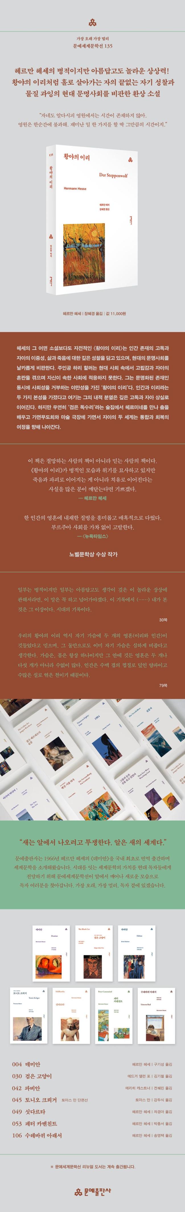 Ç츣¸¸ Çì¼¼´Â Àü ¼¼°èÀûÀ¸·Î °¡Àå ¸¹ÀÌ ÀÐÈ÷´Â µ¶ÀϾî±Ç ÀÛ°¡ Áß ÇÑ ¸íÀÌ´Ù. Çì¼¼´Â ½Ã, ¿¡¼¼ÀÌ, ´ÜÆí¼Ò¼³, ÀåÆí¼Ò¼³ µî ¼ö¸¹Àº ÀÛǰÀ» ¹ßÇ¥ÇßÀ¸³ª ±×Áß Àü ¼¼°èÀûÀ¸·Î °¡Àå ¸¹Àº »ç¶ûÀ» ¹ÞÀº °ÍÀº 1927³â¿¡ Ãâ°£µÈ ¡¶È²¾ßÀÇ À̸®¡·´Ù. ÀÌ ¼Ò¼³Àº ƯÈ÷ 1960³â´ë È÷ÇÇ ¿îµ¿ÀÇ ¿µÇ⠾Ʒ¡ ¹Ì±¹¿¡¼ Å« Àα⸦ ²ø¾ú´Âµ¥, 1969³â¿¡´Â ´Ü ÇÑ ´Þ ¸¸¿¡ 36¸¸ ±ÇÀÌ ÆÈ¸° Àûµµ ÀÖ´Ù°í ÇÑ´Ù. ¡¶È²¾ßÀÇ À̸®¡·°¡ ÀÌ·¸°Ô Å« »ç¶ûÀ» ¹ÞÀº ÀÌÀ¯´Â ¹«¾ùÀϱî? Çì¼¼ÀÇ ÀÛǰÀº ´ëü·Î ÀüÅëÀûÀÎ ¼¼°è°ü°ú °¡Ä¡°üÀ» °ÅºÎÇÏÁö¸¸ ¾ÆÁ÷ »õ·Î¿î °¡Ä¡ÀÇ ±âÁØÀ» ãÁö ¸øÇÑ ÇÑ ÀþÀºÀ̰¡ ¹æÈ²ÇÏ°í ¼ºÀåÇϸç ÀÚ½ÅÀÇ ³»¸é¿¡¼ »îÀÇ ¹æÇâÀ» ã¾Æ°¡´Â À̾߱⸦ ÁøÁ¤¼º ÀÖ°Ô, ¶§·Î´Â ¼¶¼¼ÇϰÔ, ¶§·Î´Â ´ÜÈ£ÇÑ ¹®Ã¼·Î ±×·Á³½´Ù. ±×·¸±â¿¡ ±×ÀÇ ÀÛǰÀº ½Ã´ë¸¦ ºÒ¹®ÇÏ°í »îÀÇ ÀÇ¹Ì¿Í ¾î¶»°Ô »ì¾Æ¾ß ÇÏ´ÂÁö¸¦ °í¹ÎÇÏ´Â À̵鿡°Ô, Á¸Àç ÀÌÀ¯¸¦ ã°íÀÚ ÇÏ´Â À̵鿡°Ô Ä¿´Ù¶õ ¿ï¸²À» ÁØ´Ù. ¡¶È²¾ßÀÇ À̸®¡· ¿ª½Ã ÀÌ·¯ÇÑ ±âº»ÀûÀΠƲ¿¡¼ ¹þ¾î³ªÁö ¾ÊÁö¸¸, ÀÌ ¼Ò¼³ÀÌ ´Ù¸¥ ÀÛǰ¿¡ ºñÇØ ´õ Å« »ç¶ûÀ» ¹ÞÀº °ÍÀº ¾Æ¸¶µµ ÁÖÀΰø Çϸ® ÇÒ·¯°¡ ´À³¢´Â Àý¸Á°ú ¹æÈ²ÀÌ ´õ óÀýÇϰí ÁøÁ¤¼º ÀÖ°Ô ´Ù°¡¿À°í ½Ã¹ÎÀû »î¿¡ ´ëÇÑ ¹Ý°¨°ú ÀúÇ×ÀÌ ´õ ³ë°ñÀûÀ¸·Î, ´õ ÀÚÀ¯ºÐ¹æÇÑ ÇüÅ·Π¹¦»çµÇ¾î¼ÀÏ °ÍÀÌ´Ù. ±×¸®°í ±×·¯ÇÑ Æ¯Â¡Àº ¾Æ¸¶µµ ÀÌ ¼Ò¼³ÀÌ (ÁÖÀΰø À̸§ÀÇ À̴ϼÈÀÌ Ç츣¸¸ Çì¼¼ÀÇ À̸§°ú °°´Ù´Â µ¥¿¡¼ ´ÜÀûÀ¸·Î ¾Ë ¼ö ÀÖµíÀÌ) Çì¼¼ÀÇ ±× ¾î¶² ¼Ò¼³º¸´Ùµµ ´õ ÀÚÀüÀûÀ̶ó´Â »ç½Ç°ú °ü·ÃÀÌ ÀÖ´Ù.