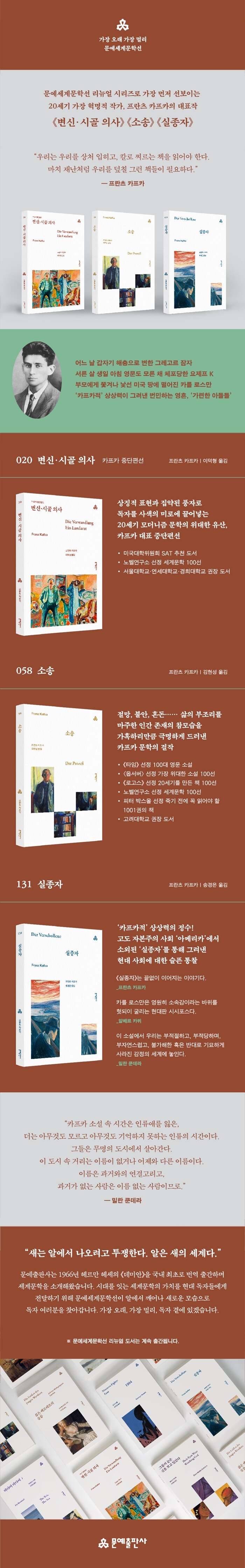 2024³âÀº 20¼¼±â ¹®Çаú ¿¹¼ú Àü¹Ý¿¡ ¶Ñ·ÇÇÑ Á·ÀûÀ» ³²±ä ÇÁ¶õÃ÷ Ä«ÇÁÄ« Ÿ°è 100ÁֱⰡ µÇ´Â ±â³äºñÀûÀÎ ÇØ´Ù. ªÀº »ý, Á×À½ÀÇ ¹®Åο¡¼µµ ¹®ÇРâÀÛ¿¡ ´ëÇÑ ¿Á¤ÀÌ ½ÄÁö ¾Ê¾Ò´ø Ä«ÇÁÄ« ¹®ÇÐÀÇ Á¤¼ö°¡ ´ã°Ü ÀÖÀ¸¸ç, ±¹°¡¿Í ¾ð¾î, ½Ã´ë¸¦ ³Ñ¾î °¡Àå »ç¶û¹Þ´Â ´ëÇ¥ÀÛ 3Á¾ ¡¶º¯½Å¡¤½Ã°ñ Àǻ硷 ¡¶¼Ò¼Û¡· ¡¶½ÇÁ¾ÀÚ¡·¸¦ ¼¼Æ®·Î ¹¾ú´Ù. ȯ»ó°ú ½Ç»óÀ» Á¤±³ÇÏ°Ô µÚ¼¯¾î ±â¹¦Çϸ鼵µ ±Ø¸íÇÏ°Ô Çö½ÇÀ» µéÃß´Â Ä«ÇÁÄ«ÀÇ ¡¶º¯½Å¡¤½Ã°ñ Àǻ硷 ¡¶¼Ò¼Û¡· ¡¶½ÇÁ¾ÀÚ¡·´Â ¡®Ä«ÇÁÄ«Àû¡¯ »ó»ó·ÂÀÌ ºûÀ» ¹ßÇϸç Çö´ë µ¶ÀÚ¿¡°Ôµµ ¹®ÇÐÀû Àç¹Ì´Â ¹°·Ð »î°ú Á×À½¿¡ °üÇÑ ±íÀº ÅëÂû°ú ¿µ°¨À» ÁÖ´Â °íÀüÀÌ´Ù.