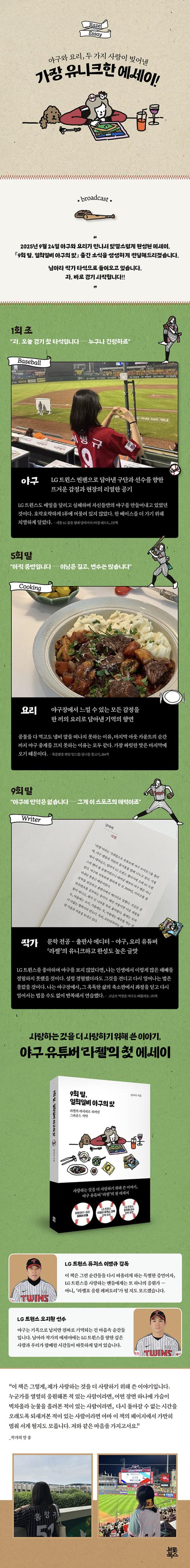 ¾ß±¸¸¦ »ç¶ûÇÏ´Â µ¶ÀÚ¿¡°Ô´Â ±×¶ó¿îµå¿¡¼ ´À²¼´ø »ý»ýÇÑ °¨Á¤ÀÌ ±Û ¼Ó¿¡¼ µÇ»ì¾Æ³ª´Â °æÇèÀÌ µÉ °ÍÀ̰í, À½½ÄÀ» »ç¶ûÇÏ´Â µ¶ÀÚ¿¡°Ô´Â ½ÄŹ À§ÀÇ ¸ÀÀ» ÅëÇØ °æ±âÀÇ ±äÀå°ú ȯÈñ¸¦ »õ·Ó°Ô ´À³¥ ¼ö ÀÖ´Â ±âȸ°¡ µÉ °ÍÀÌ´Ù. ¡º9ȸ ¸», ÀÏÈñÀϺñ ¾ß±¸ÀÇ ¸À¡»Àº °á±¹ ¾ß±¸¿Í ¿ä¸®, µÎ °¡Áö ¼¼°è°¡ ¸¸³ª ¿Ï¼ºÇÑ °¡Àå À¯´ÏÅ©ÇÑ ¿¡¼¼ÀÌ·Î, ¿ì¸®°¡ »ç¶ûÇÏ´Â °ÍÀ» ¿À·¡µµ·Ï °ö¾ÃÀ» ¼ö ÀÖ´Â ¡®»îÀÇ ¸À¡¯À» ¼±¹°ÇÑ´Ù.