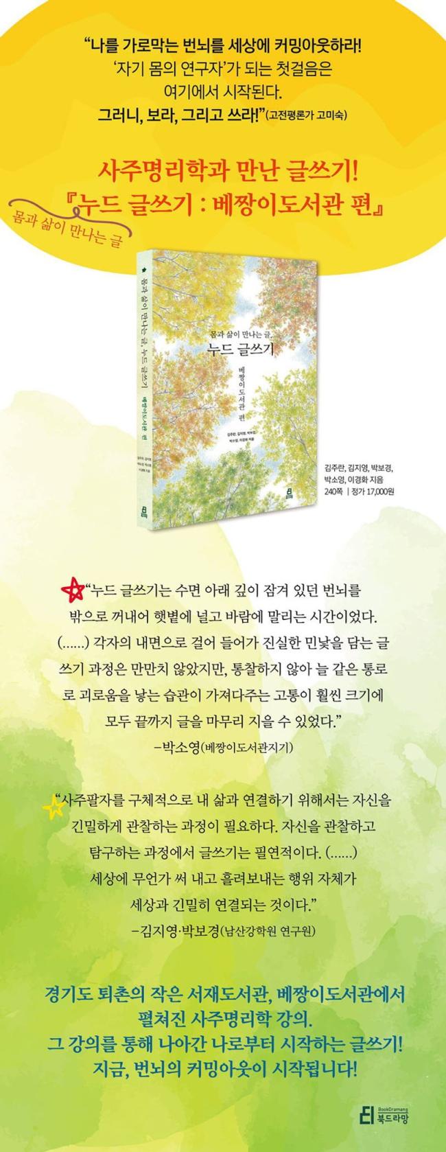 ÀÚ±â ÀÌÇØ¿Í Àڱ⠼ö·ÃÀÇ ÀÏȯÀ¸·Î ¼ö³â°£ ¡´°¨À̴硵¿¡¼ À̲ø¾î ¿Â »çÁÖ¸í¸® ½ÉÈ °úÁ¤ ¡®´©µå ±Û¾²±â¡¯, À̹ø¿¡´Â º£Â¯À̵µ¼°ü ÆíÀÌ´Ù. °æ±âµµ ÅðÃÌÀÇ ÀÛÀº ¼Àçµµ¼°üÀÎ º£Â¯À̵µ¼°ü¿¡¼ ¡´°¨À̴硵 ÆÀÀÌ »çÁÖ¸í¸® ¼ö¾÷À» ÁøÇàÇß°í, ±× °úÁ¤À» ÅëÇØ °»ç¿Í ÇÐÀÎ ¸ðµÎ ÀÚ½ÅÀÇ ¿î¸íÀ» ÇØ¼®Çϰí ÀÚÀǽİú ¹ø³ú¸¦ ¹þ¾î³»´Â ±Û¾²±â-°øµ¿Ã¼°¡ µÇ¾î ÀÌ Ã¥À» °á°ú¹°·Î ³»³õ¾Ò´Ù. »çÁÖ¸í¸®ÀÇ ±âº»°ú ¹ø³ú Å»ÃâÀÇ ±âº»À» ¹è¿ï ¼ö Àִ å.
