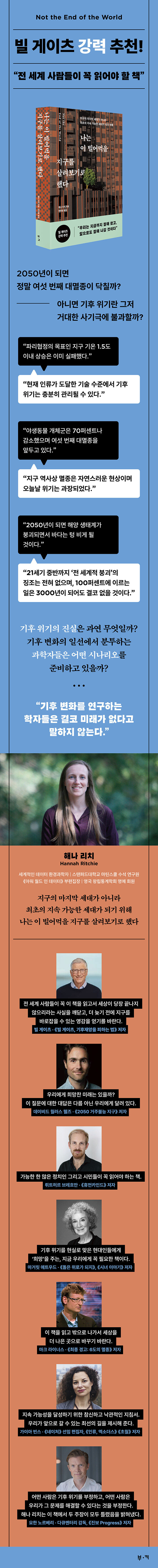 ¡¶³ª´Â ÀÌ ºô¾î¸ÔÀ» Áö±¸¸¦ »ì·Áº¸±â·Î Çß´Ù¡·´Â ÀÌ·¯ÇÑ ¿äû¿¡ ´äÇϰíÀÚ ³ª¿Â Ã¥ÀÌ´Ù. ºô °ÔÀÌÃ÷°¡ Àü ¼¼°èÀο¡°Ô Çʵ¶À» ±ÇÇÑ ÀÌ Ã¥¿¡¼ ÀúÀÚ ÇØ³ª ¸®Ä¡´Â Çϴÿ¡¼ ½ÃÀÛÇØ ¾Æ·¡·Î ³»·Á¿À´Â ¼ø¼·Î ´ë±â¿À¿°ºÎÅÍ ±âÈÄ º¯È, »ï¸² ÆÄ±«, ½Ä·® ¹®Á¦, »ý¹°´Ù¾ç¼º ÈѼÕ, ÇÃ¶ó½ºÆ½ ¾²·¹±â, ¾î·ù ³²È¹ µî ÇöÀç Àηù°¡ ¸Â´Ú¶ß¸° Àϰö °¡Áö Áß´ëÇÑ È¯°æ ¹®Á¦ÀÇ ½ÇŸ¦ ³¹³¹ÀÌ ¹àÈ÷°í ÀÖ´Ù. ÇØ³ª ¸®Ä¡´Â ¿Á½ºÆÛµå´ëÇб³ ¸¶Æ¾½ºÄðÀÇ ¼ö¼® ¿¬±¸¿øÀÌÀÚ ¡¶¾Æ¿ö ¿ùµå ÀÎ µ¥ÀÌÅÍ¡·ÀÇ ºÎÆíÁýÀåÀ¸·Î¼, ¿Â½Ç°¡½ººÎÅÍ »ï¸²°ú ¾î·ù ¹× ½Ä·® ÀÚ¿ø¿¡ À̸£±â±îÁö Áö±¸ ȯ°æ°ú °ü·ÃµÈ Àü ¼¼°è µ¥ÀÌÅ͸¦ ¼öÁýÇÏ°í ºÐ¼®ÇÏ´Â µ¥ÀÌÅÍ Àü¹®°¡ÀÌÀÚ È¯°æ°úÇÐÀÚ´Ù. ±×´Â Äڷγª19 ÆÒµ¥¹Í ½Ã±â ´ç½Ã Äڷγª19 Á¤º¸ ´ë½Ãº¸µå¸¦ ±¸ÃàÇßÀ¸¸ç, ´ç½Ã Á¤¸®µÈ ºÐ¼® ÀÚ·á´Â Áö±Ýµµ ¿©·¯ ±¹°¡ Á¤ºÎ¿Í ¾ð·Ð¿¡¼ ÀοëµÇ°í ÀÖ´Ù.
