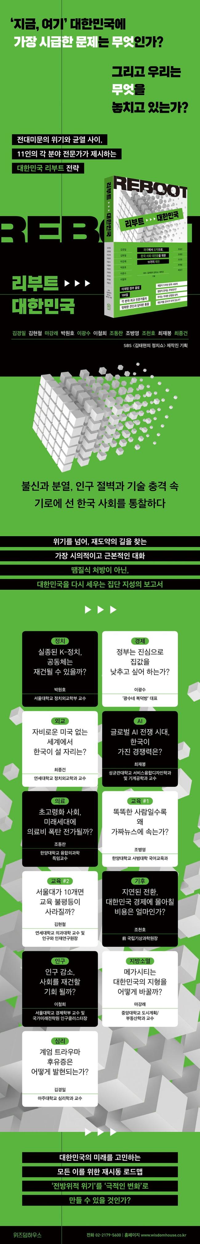 ¡¶¸®ºÎÆ® ´ëÇѹα¹¡·Àº ¹Ù·Î ÀÌ ÁöÁ¡¿¡¼ Ãâ¹ßÇÑ´Ù. SBS ¡´±èÅÂÇöÀÇ Á¤Ä¡¼î¡µ°¡ Ưº° ±âȹÇÑ ¡®´ë¼±Æ¯Áý ¸®ºÎÆ® 2025¡¯ ½Ã¸®Á Åä´ë·Î, Á¤Ä¡°æÁ¦¿Ü±³±â¼úÀÇ·á±³À°Àα¸±âÈÄÁö¹æ¼Ò¸ê½É¸® µî ÇÙ½É ºÐ¾ßÀÇ ÃÖ°í ±ÇÀ§ÀÚ 11ÀÎÀÇ ÀÎÅͺ並 Áý¾àÇÑ Áý´Ü Áö¼ºÀÇ ±â·ÏÀÌ´Ù. ÀúÀÚµéÀº ´Ü¼øÇÑ Áø´ÜÀÌ ¾Æ´Ï¶ó, ±¹°¡Àû À§±â ÀÌÈÄ ¿ì¸® »çȸ°¡ ¡®¾îµð¼ ¸ØÃè°í ¾îµð·Î ³ª¾Æ°¡¾ß ÇÏ´ÂÁö¡¯¸¦ ÀÔüÀûÀ¸·Î »ìÆìº¸¸ç ´ëÇѹα¹ Àç½ÃÀÛÀÇ ·Îµå¸ÊÀ» ±×·Áº»´Ù. Á¤Ä¡´Â ¾î¶»°Ô ÇÕÀÇ¿Í ½Å·Ú¸¦ ȸº¹ÇØ¾ß Çϴ°¡? ÀÌÀç¸í Á¤ºÎ´Â Áý°ªÀ» ³·Ãâ ÀÇÁö°¡ Àִ°¡? ÀÚ±¹ ¿ì¼±ÁÖÀÇ·Î µ¹¾Æ¼± ¹Ì±¹ ¾Õ¿¡¼ Çѱ¹ ¿Ü±³´Â ¾î¶² Àü·«Àû °ø°£À» ¿¾î¾ß Çϴ°¡? ÀÇ·á±³À°Àα¸±âÈÄ ¹®Á¦´Â ¾î¶»°Ô Ç®¾î¼ ´Ù½Ã ¹Ì·¡¸¦ ÇâÇÑ µ¿·ÂÀ» ¸¸µé¾î³¾ °ÍÀΰ¡? ÀÌ Ã¥Àº ±× ¸ðµç Áú¹®À» ½¬¿î ¾ð¾î·Î, ¹Ðµµ ÀÖ´Â ´äº¯À¸·Î ÇØ¹ýÀ» Á¦½ÃÇÑ´Ù.