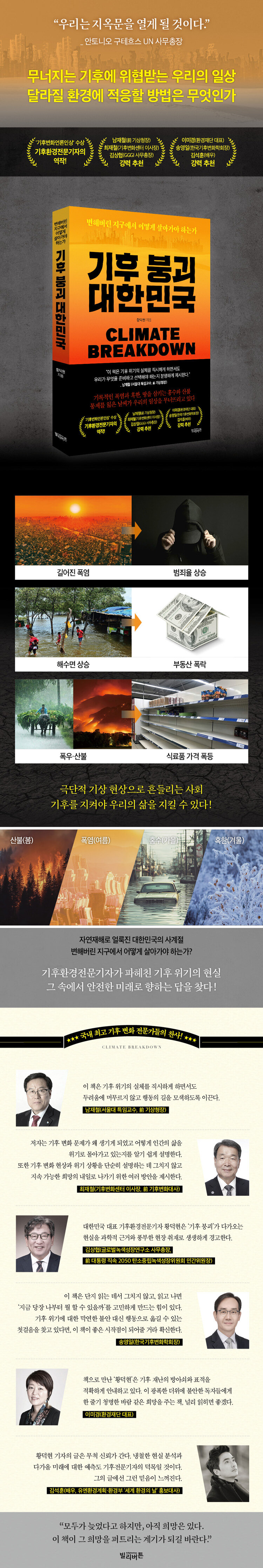 ±âÈÄȯ°æ Àü¹® ±âÀÚÀÎ ÀúÀÚ´Â ¼ö³â°£ÀÇ ÃëÀç¿Í ÀڷḦ Åä´ë·Î ÀÌ¹Ì ¹«³ÊÁ® ³»¸®°í ÀÖ´Â ´ëÇѹα¹ÀÇ Çö½ÇÀ» ±¸Ã¼ÀûÀ¸·Î º¸¿©ÁØ´Ù. Ã¥ ¼Ó¿¡¼ µå·¯³ª´Â »ç½ÇµéÀº Ãæ°ÝÀûÀÌ´Ù. ¿ì¸®°¡ Æò¹üÇÑ ÀÏ»óÀ» À¯ÁöÇϱâ À§ÇØ ÁöºÒÇØ¾ß ÇÒ ´ë°¡°¡ »ó»ó ÀÌ»óÀ¸·Î Å©´Ù´Â °ÍÀÌ´Ù. ±×·¯³ª ¡º±âÈÄ ºØ±« ´ëÇѹα¹¡»Àº ´Ü¼øÇÑ °øÆ÷ÀÇ ±â·Ï¿¡ ¸Ó¹°Áö ¾Ê´Â´Ù. ±âÈÄ º¯ÈÀÇ ¼Óµµ¸¦ ´ÊÃß°í ¿ì¸®ÀÇ »îÀ» Áö۱â À§ÇØ Áö±Ý ´çÀå ¹«¾ùÀ» ÇØ¾ß ÇÏ´ÂÁö, Çö½ÇÀûÀÎ ÇØ´äÀ» Á¦½ÃÇÑ´Ù. ´Ê¾ú´Ù°í Æ÷±âÇϱ⿡´Â ¾ÆÁ÷ Èñ¸ÁÀÌ ÀÖ´Ù. ÀÌ Ã¥Àº ÇൿÇÏÁö ¾Ê´Â´Ù¸é ¸ÂÀÌÇÏ°Ô µÉ ½É°¢ÇÑ ¹Ì·¡¿¡ ´ëÇØ °æ°íÇÏ´Â µ¿½Ã¿¡, Çൿ¿¡ ³ª¼±´Ù¸é ±× ¹Ì·¡¸¦ ¹Ù²Ü ¼ö ÀÖ´Ù´Â ¹ÏÀ½À» ÇÔ²² ÀüÇϴ åÀÌ´Ù.