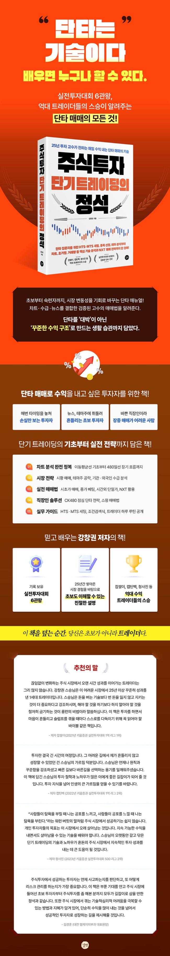 ½ÇÀüÅõÀÚ´ëȸ 6°ü¿Õ, ¾ï´ë ¼öÀÍÀ» ³»´Â Æ®·¹ÀÌ´õµéÀÇ ½º½Â °Ã¢±Ç Æ®·¹ÀÌ´õ°¡ 25³âÀÇ ¸Å¸Å °æÇè°ú ³ëÇϿ츦 ÇÑ ±ÇÀÇ Ã¥¿¡ ´ã¾Æ³Â´Ù. ÀÌ Ã¥Àº Ãʺ¸ ÅõÀÚÀÚºÎÅÍ ¼÷·Ã Æ®·¹ÀÌ´õ±îÁö ¡®²ÙÁØÈ÷¡¯ ¼öÀÍÀ» ³»´Â ¹æ¹ýÀ» ü°èÀûÀ¸·Î ¾È³»ÇÑ´Ù. ½ºÄ¶ÇÎ, µ¥ÀÌÆ®·¹À̵ù, ½ºÀ® Æ®·¹À̵ù µîÀÇ ´Ü±â ¸Å¸Å ¹æ¹ýÀ» ½ÇÀü ¿¹½Ã¿Í ÇÔ²² ¼³¸íÇϰí, Â÷Æ®¡¤¼ö±Þ¡¤´º½º¸¦ °áÇÕÇÑ °í¼öµéÀÇ Àü·«À» ¾Ë·ÁÁØ´Ù. ¶ÇÇÑ Àü¾÷ ÅõÀÚÀڷμ ÅõÀÚ ±â¼ú¿¡¸¸ Ä¡¿ìÁöÁö ¾Ê°í ½É¸®ÀûÀ¸·Î Á» ´õ ¾ÈÁ¤ÀûÀ¸·Î ÅõÀÚÇÒ ¼ö ÀÖµµ·Ï µµ¿ÍÁÖ´Â »ýȰ ½À°ü ¸¸µå´Â ¹ýµµ ´ã¾Ò´Ù. Ãʺ¸ ÅõÀÚÀÚ¿¡°Ô´Â ´Ü±â Æ®·¹À̵ùÀÇ ±âÃʺÎÅÍ Ã¼°èÀûÀ¸·Î ¹è¿ï ¼ö ÀÖ´Â ±âº»¼·Î, ¼÷·ÃµÈ Æ®·¹ÀÌ´õ¿¡°Ô´Â ¸ÅÀÏ ºü¸£°Ô º¯ÈÇÏ´Â ½ÃÀå¿¡¼ »ì¾Æ³²À» ¼ö ÀÖ´Â Àü¼úÀ» ¾Ë·ÁÁÖ´Â ½ÇÀü ¸Å´º¾óÀÌ´Ù. ÀÌ Ã¥À» ÅëÇØ ½ÃÀåÀÇ º¯µ¿¼ºÀ» ±âȸ·Î ¹Ù²Ù¾î ¼º°øÇÏ´Â Æ®·¹ÀÌ´õ·Î ¼ºÀåÇÒ ¼ö ÀÖÀ» °ÍÀÌ´Ù.
