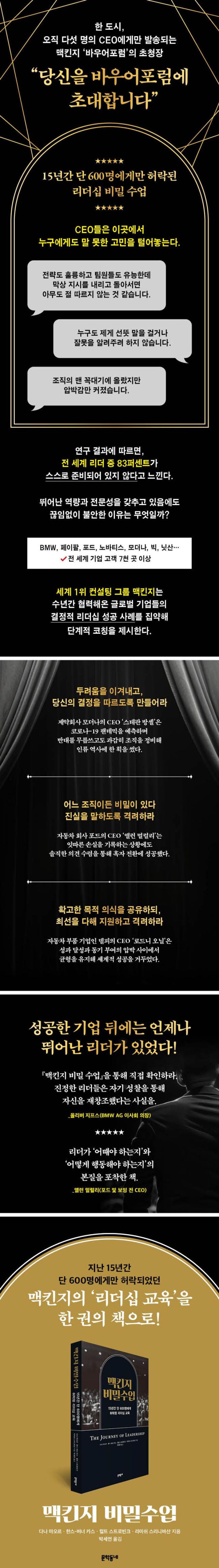 ¡º¸ÆÅ²Áö ºñ¹Ð ¼ö¾÷¡»Àº ÀÌ ³»·Î¶óÇÏ´Â CEOµéÀÌ Åоî³õÀº °í¹Î, ÀÌ¿¡ ´ëÇÑ °ø°¨°ú ºÐ¼®, ³ª¾Æ°¡ ¸ÆÅ²ÁöÀÇ ÄÚÄ¡µéÀÌ Á¦¾ÈÇÏ´Â ÇØ°áÀÇ ½Ç¸¶¸®¸¦ ¼Ò°³Çϰí ÀÖ´Ù. µö·¯´× ±â¼ú Ȱ¿ëÀ¸·Î Äڷγª Àü¿°º´ÀÇ ½É°¢¼ºÀ» ¿¹ÃøÇϰí Á¶Á÷ Àüü°¡ »õ·Î¿î ¹é½Å »ý»ê¿¡ ¶Ù¾îµéµµ·Ï °áÁ¤ÇÑ ¸ð´õ³ª, µ¿±â ºÎ¿© °úÁ¦¿Í ¼º°ú ´Þ¼º ¾Ð¹ÚÀ̶ó´Â °úÁ¦ »çÀÌ¿¡¼ ½É¸®Àû ±ÕÇüÀ» À¯ÁöÇÏ¸ç ¼¼°èÀû ÀÚµ¿Â÷ ºê·£µå·Î ¹ßµ¸¿òÇÑ µ¨ÇÇ, ±â¾÷ÀÌ °è¼ÓÇØ¼ ¼Õ½ÇÀ» ±â·ÏÇÏ´Â »óȲ¿¡µµ °³¹æÀûÀÌ°í ¼ÖÁ÷ÇÑ ÀÇ°ß ¼ö·ÅÀ» ÅëÇØ ÈæÀÚ Àüȯ¿¡ ¼º°øÇÑ Æ÷µåÀÇ »ç·Ê µî ¸ÆÅ²Áö ÆÄÆ®³Ê ¹× ¸®´õ½Ê Àü¹® ÄÚÄ¡¿Í ±Û·Î¹ú ´ë±â¾÷ CEO µéÀÇ Ç³ºÎÇÑ °æÇè°ú ±â¾÷ ¿î¿µ »ç·Ê·Î °¡µæÇÏ´Ù. ³ª¾Æ°¡ ÀÌ·ÐÀ̳ª Àü·«ÀÇ ¿øÄ¢À» ¹àÈ÷´Â µ¥ ¸Ó¹«¸£Áö ¾Ê°í ±¸Ã¼ÀûÀΠüũ¸®½ºÆ®¸¦ Á¦°øÇϸç, ¸ÆÅ²ÁöÀÇ ÄÚÄ¡µéÀÌ Á¦½ÃÇÏ´Â ¾à 100°¡ÁöÀÇ ¼¼ºÎÀûÀÎ Á¢±Ù ¹æ½Ä ¶ÇÇÑ ´ã¾Ò´Ù.