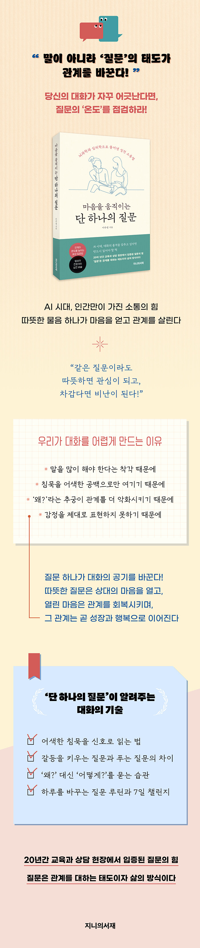 ¸»Àº Á¤º¸¸¦ ÁÖ°í¹ÞÁö¸¸, ´ëÈ´Â °¨Á¤À» ³ª´«´Ù. AI ½Ã´ë¿¡µµ Áú¹®Àº ¿©ÀüÈ÷ Àΰ£¸¸ÀÌ ÇÒ ¼ö ÀÖ´Â ¼ÒÅëÀÇ ¹æ½ÄÀÌ´Ù. µû¶æÇÑ Áú¹® ÇѸ¶µð°¡ °ü°è¸¦ ȸº¹½Ã۰í, ¿¸° ¸¶À½ÀÌ ¼ºÀåÀ» ³ºÀ¸¸ç, ¼ºÀåÀº °á±¹ ÇູÀ¸·Î À̾îÁø´Ù. ¿À´Ã ³»°¡ °Ç³×´Â Áú¹®ÀÌ ´©±º°¡¿¡°Ô »óó°¡ µÉÁö, ¿ë±â°¡ µÉÁö´Â ³ªÀÇ Åµµ¿¡ ´Þ·Á ÀÖ´Ù.