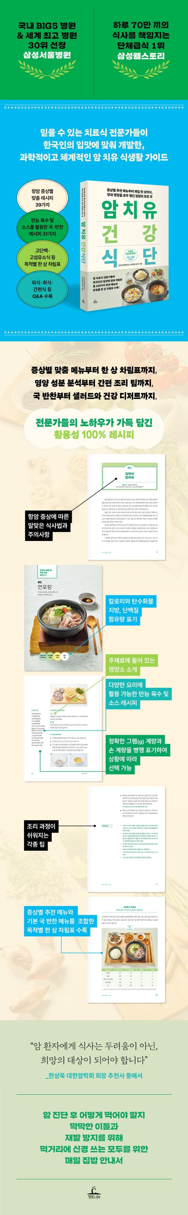 ¾Ï Áø´ÜÀ» ¹Þ°í Åõº´ ÁßÀ̰ųª ¼ö¼ú ÈÄ Àç¹ß ¹æÁö¸¦ °ÆÁ¤ÇÏ´Â »ç¶÷µéÀÌ °¡Àå ½Å°æ ¾²´Â °ÍÀÌ ¹Ù·Î ¡®¾î¶»°Ô ¸ÔÀ»±î¡¯ ÇÏ´Â ºÎºÐÀÌ´Ù. ÀÌ Ã¥Àº ±¹³» BIG 5 º´¿ø Áß ÇϳªÀÌ¸ç ¡´´º½ºÀ§Å©¡µ ¼±Á¤ ¼¼°è ÃÖ°í º´¿ø 30À§¿¡ ºû³ª´Â »ï¼º¼¿ïº´¿ø, ±×¸®°í ´Üü±Þ½Ä 1À§¸¦ Â÷ÁöÇÏ¸ç ¼ö¸¹Àº º´¿ø½ÄÀ» Ã¥ÀÓÁö°í ÀÖ´Â »ï¼ºÀ£½ºÅ丮ÀÇ Àü¹®°¡µéÀÌ ¸¸³ª ÇÔ²² °³¹ßÇÑ ¸Þ´º¿Í ½Ä»ç¹ýÀ» ´ãÀº °¡À̵åºÏÀÌ´Ù.