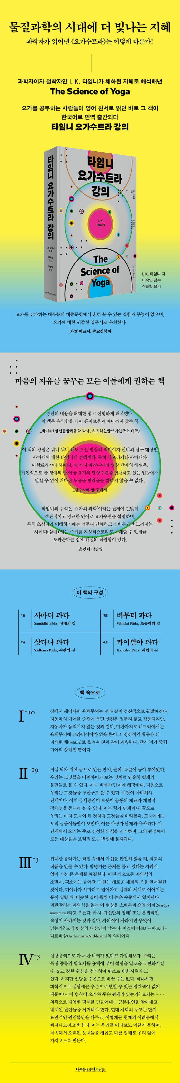 °úÇÐÀÚÀÌÀÚ Ã¶ÇÐÀÚÀÎ I. K. ŸÀӴϰ¡ Ã¼ÈµÈ ÁöÇý·Î ÇØ¼®Çس½ ¡¶The Science of Yoga¡·, ¿ä°¡¸¦ °øºÎÇÏ´Â »ç¶÷µéÀÌ ¿µ¾î ¿ø¼·Î Àдø ¹Ù·Î ±× Ã¥ÀÌ Çѱ¹¾î·Î Ãâ°£µÇ¾ú´Ù. Á¾±³Ã¶ÇÐÀÚ Ä«·¼ º£¸£³Ê´Â ÀÌ Ã¥¿¡ ´ëÇØ ¡°¿ä°¡¸¦ ÀüÆÄÇÏ´Â ´ëºÎºÐÀÇ ´ëÁß¹®Çå¿¡¼ ÈçÈ÷ º¼ ¼ö ÀÖ´Â °áÇÔ°ú ¹«´ÉÀÌ ¾øÀ¸¸ç, ¿ä°¡¿¡ ´ëÇÑ ±ÍÁßÇÑ ÀÔ¹®¼·Î Ãßõ¡±ÇÑ ¹Ù ÀÖ´Ù. ¡¶Å¸ÀÓ´ÏÀÇ ¿ä°¡¼öÆ®¶ó °ÀÇ¡·¸¦ ÅëÇØ ¡¶¿ä°¡¼öÆ®¶ó¡·¿¡ ´ã±ä öÇÐÀû, ¼öÇàÀû Á¤¼ö¸¦ °£°áÇϸ鼵µ ¸íÄèÇÏ°Ô ÀÌÇØÇÒ ¼ö ÀÖÀ» °ÍÀÌ´Ù.