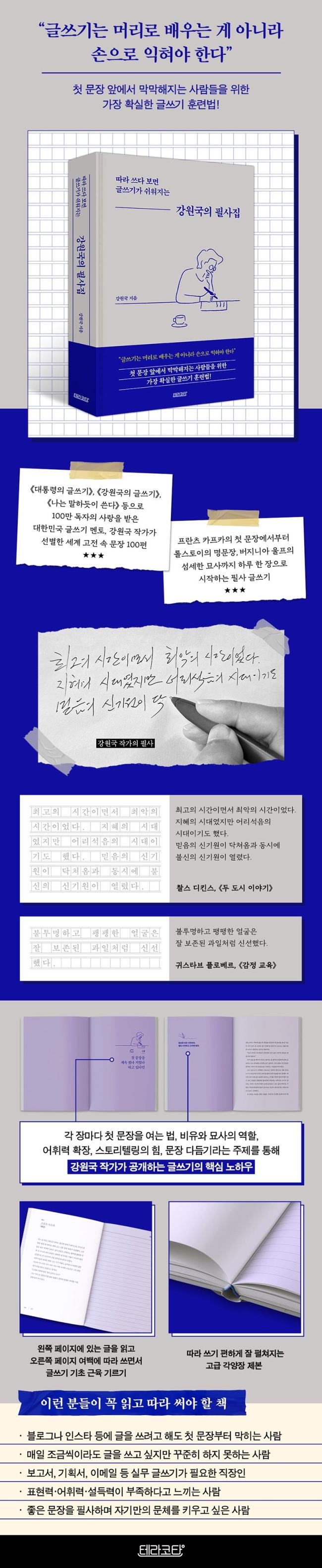 ¡¶´ëÅë·ÉÀÇ ±Û¾²±â¡·, ¡¶°¿ø±¹ÀÇ ±Û¾²±â¡·, ¡¶³ª´Â ¸»ÇϵíÀÌ ¾´´Ù¡· µîÀ¸·Î 100¸¸ µ¶ÀÚÀÇ »ç¶ûÀ» ¹ÞÀº ´ëÇѹα¹ ±Û¾²±â ¸àÅä °¿ø±¹ÀÌ °¡Àå È®½ÇÇÑ ±Û¾²±â ÈÆ·Ã¹ýÀ» ¾È³»ÇÏ´Â ¡¶µû¶ó ¾²´Ù º¸¸é ±Û¾²±â°¡ ½¬¿öÁö´Â °¿ø±¹ÀÇ ÇÊ»çÁý¡·À» Ãâ°£Çß´Ù.
