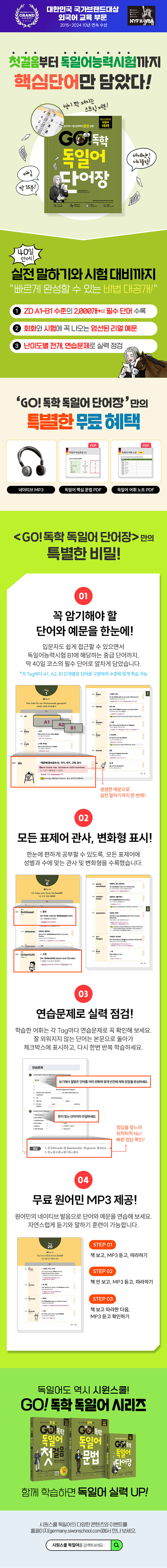 ¹«·á ¿ø¾î¹Î MP3¸¦ µéÀ¸¸ç ´Ü¾î¿Í ¿¹¹®À» Á¤È®ÇÑ ¹ßÀ½À¸·Î µû¶óÇØ º¸¼¼¿ä. ±×¸®°í µ¶ÀϾî ÇÙ½É ¹®¹ý PDF, µ¶ÀÏ¾î ¾îÈÖ ³ëÆ® PDF¸¦ ÅëÇØ ¹è¿î ³»¿ëÀ» º¹½ÀÇϰí źźÇÑ µ¶ÀÏ¾î ½Ç·Â±îÁö ÇÔ²² ½×¾Æ º¸¼¼¿ä.