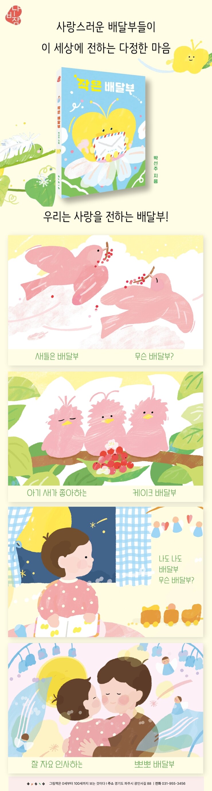 ³ªºñ°¡ »ì¶û»ì¶û ³ª¹µÀÙ ÇÑ ÀåÀ» µé°í °¡¿ä. ³ªºñ´Â ¹«½¼ ¹è´ÞºÎÀϱî¿ä? ¸ðµç ²ÉµéÀÌ ±Í ±â¿ïÀÌ°í ½ÍÀº ÆíÁö ¹è´ÞºÎÀÔ´Ï´Ù. »õµéÀÌ »¡°£ ¿¸Å°¡ ¿ÀÁ¾Á¾ ´Þ¸° ³ª¹µ°¡Áö¸¦ ¹°°í °¡¿ä. »õµéÀº ¹«½¼ ¹è´ÞºÎÀϱî¿ä? ¾Æ±â »õµéÀ» À§ÇØ ¿¸Å¸¦ Â÷°îÂ÷°î ½×¾Æ ¸¸µç ÄÉÀÌÅ© ¹è´ÞºÎÀÔ´Ï´Ù. ±×·³ »ç¶û½º·¯¿î ÀÛÀº ¾Æ±â´Â ¹«½¼ ¹è´ÞºÎÀϱî¿ä? ¾ö¸¶ »´¿¡ ÂÊ Àß ÀÚ¿ä ÀλçÇÏ´Â »Ç»Ç ¹è´ÞºÎÀÌÁö¿ä. ÀÌ Ã¥Àº ¼·Î°¡ ¼·Î¸¦ »ý°¢ÇÏ´Â ´ÙÁ¤ÇÑ ¸¶À½°ú »ç¶ûÀ» ³ª´©´Â ¹æ¹ýÀ» ÀÚ¿¬ÀÇ ÀÛÀº Á¸ÀçµéÀ» ºô·Á ¸»ÇÕ´Ï´Ù.