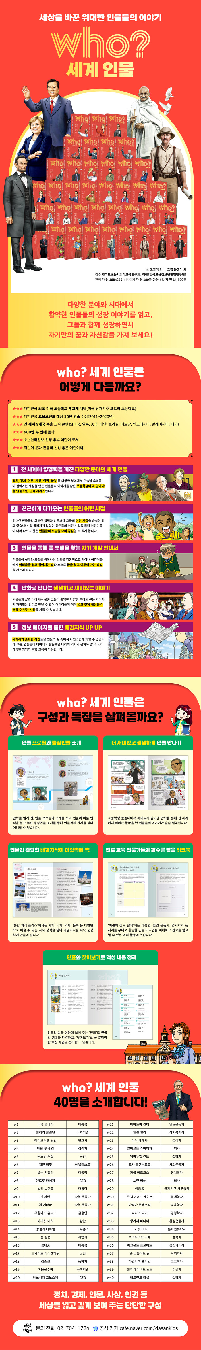 ¡´who? ¼¼°è Àι°¡µ ½Ã¸®Áî´Â Á¤Ä¡, °æÁ¦, Àι®, »ç»ó, ÀαÇ, ȯ°æ µî ´Ù¾çÇÑ ºÐ¾ß¿¡¼ ¿À´Ã³¯ ¿ì¸®µéÀÌ »ì¾Æ°¡´Â ¼¼»óÀ» ¸¸µç Àι°µéÀÇ À̾߱⸦ ´ãÀº ÃʵîÇлýÀÌ ²À ¾Ë¾Æ¾ß ÇÒ Àι° ÇнÀ ¸¸È ½Ã¸®Áî´Ù. ¸ðµç À§ÀÎÀÌ ¾î¸° ½ÃÀýºÎÅÍ ´ë´ÜÇÑ »ç¶÷À̾ú´ø °ÍÀº ¾Æ´Ï´Ù. ¡´who? ¼¼°è Àι°¡µ ½Ã¸®Áî´Â À§´ëÇÑ Àι°µéÀÇ È·ÁÇÑ ¾÷Àû°ú ¼º°øº¸´Ù ±×µéÀÇ ¾î¸° ½ÃÀýÀ» Ãæ½ÇÈ÷ ´ã°í ÀÖ´Ù.