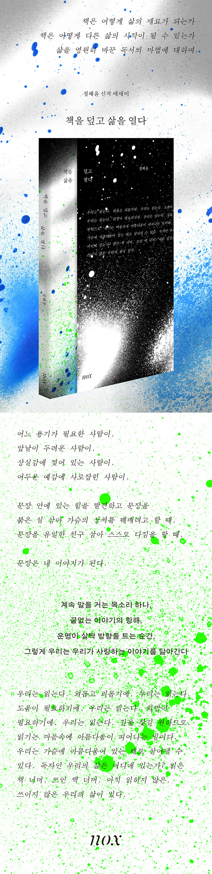 ¡ºÃ¥À» µ¤°í »îÀ» ¿´Ù¡»´Â ÀúÀÚ°¡ Ã¥À» ÅëÇØ º¯½ÅÇÏ°Ô µÈ ¼ø°£µéÀÇ ±â·ÏÀÌÀÚ ±×°¡ »ç¶ûÇÏ´Â ÀÛ°¡µé¿¡ ´ëÇÑ Çå»ç´Ù. ¡º¹Ùº£Æ®ÀÇ ¸¸Âù¡»¿¡¼ õÀç ¿ä¸®»çÀÇ ¼ÕÀ» µé¿©´Ùº¸¸é¼ ÀÚÀ¯¿Í ¿¹¼úÀÇ ÁøÁ¤ÇÑ Àǹ̸¦ ¹ß°ßÇÑ ¼ø°£. ÇѶ§ ¼¼°è¿©Çà °¡À̵åºÏó·³ Àоú´ø °íÀü ¡º¸ðºñ µñ¡»À» ´Ù½Ã ÀÐÀ¸¸é¼ °¨ÅºÇÒ ÁÙ ¾Æ´Â Àΰ£À¸·Î º¯¸ðÇÏ°Ô µÈ ¼ø°£. Á¦ÇÁ ´ÙÀ̾îÀÇ ¡º±×·¯³ª ¾Æ¸§´Ù¿î¡»À» ÀÐÀ¸¸é¼ ´õ ¾ÕÀ¸·Î ³ª¾Æ°¡Áö ¸øÇÒ ¶§ ¾î¶»°Ô Çö½ÇÀ» ´Ù½Ã À籸¼ºÇÒ ¼ö ÀÖ´ÂÁö ±ú´ÞÀº ¼ø°£. Ä®ºñ³ëÀÇ ÀÛǰÀ» Àаí Çö½ÇÀÇ ¹«°Å¿ò¿¡ Áþ´¸®Áö ¾Ê°í °¡º±°Ô ¾ÕÀ¸·Î ³ª¾Æ°¡´Â ¹ýÀ» ¹è¿î ¼ø°£. Àß µé¸®Áö ¾Ê´Â »ç¶÷µéÀÇ Ä£±¸°¡ µÇ·Á°í ¡ºÈ£¶óÀÌÁð¡»À» ¾´ º£¸® ·ÎÆäÁ µû¶ó ¡°¼·Î¸¦ À§ÇÑ À̾߱â²Û¡±ÀÌ µÇ¾î¾ß°Ú´Ù°í ´ÙÁüÇÑ ¼ø°£. ÀÌ À̾߱âµéÀ» ±×·¯¸ð¾Æ ÀúÀÚ°¡ ÇÏ°í ½ÍÀº ¸»Àº ºÐ¸íÇÏ´Ù. À̾߱âÇÏ´Â µ¿¹°·Î¼ ¿ì¸®ÀÇ ÀÓ¹«´Â ¡°ÀÚ½ÅÀÇ À̾߱⸦ ã´Â °Í, ¿ì¸®ÀÇ À̾߱⸦ ³²ÀÌ ´ë½ÅÇÏ°Ô ÇÏÁö ¾Ê´Â °Í, ¿ì¸®ÀÇ °¡Àå ¸ÚÁø Á¡À» À̾߱âÇÏ´Â ¹æ¹ýÀ» ã´Â °Í¡±ÀÌ´Ù. ±×·¸°Ô ¿ì¸®´Â Ã¥ÀÇ ¹®ÀåÀ», »îÀÇ À̾߱⸦ ÀÐÀ¸¸ç ÀÚ½ÅÀÌ ´©±¸¿´´ÂÁö°¡ ¾Æ´Ï¶ó ´©±¸ÀÌ°í ½ÍÀºÁö ¾Ë ¼ö ÀÖ´Ù. ±×·¸°Ô ¿ì¸®´Â ¿ì¸®°¡ ÀÌ¾î ºÙÀÎ À̾߱⸦, »ç¶ûÇÏ´Â À̾߱⸦ ´à¾Æ°£´Ù.