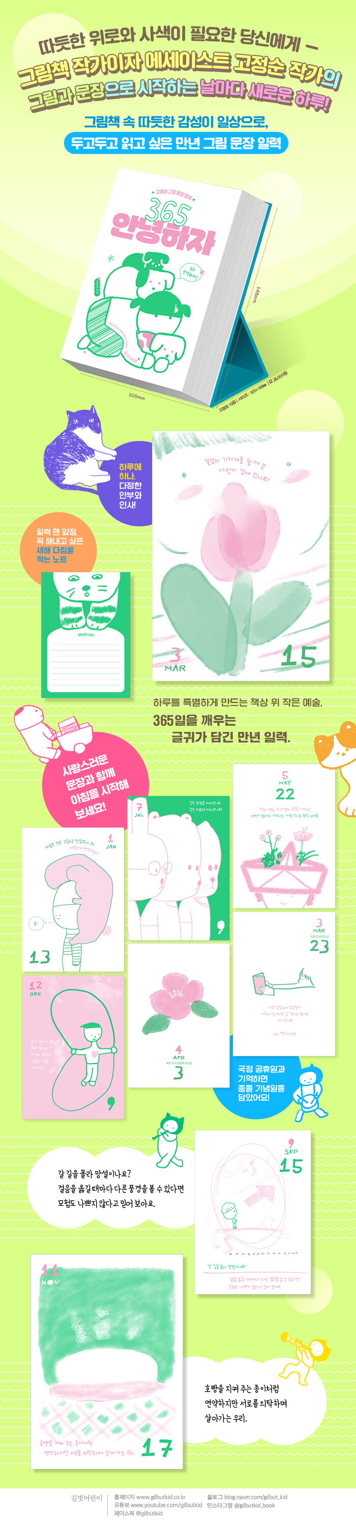 ¡¶365 ¾È³çÇÏÀÚ¡·´Â ´ëÇѹα¹ ±×¸²Ã¥»ó Ưº°»ó, ÈÀÌÆ® ·¹À̺콺 ¼±Á¤ ÀÛ°¡ °íÁ¤¼øÀÇ »ç¶û½º·´°í ±Í¿©¿î µå·ÎÀ×°ú 365ÀÏÀ» ±ú¿ì´Â ±Û±Í°¡ ´ã±ä ¸¸³â ÀÏ·ÂÀÔ´Ï´Ù. ÇÏ·çÇÏ·ç ¿ì¸®¿¡°Ô ÈûÀ» ÁÖ´Â ÀÀ¿ø°ú °Ý·ÁÀÇ ½Ã°£, ¾²°í Àд »ç¶÷ °íÁ¤¼ø ÀÛ°¡ÀÇ ¿µ°¨À» ºÒ·¯ÀÏÀ¸Å°´Â ±Û±Í¿Í °í¾çÀÌÀÇ ¾û¶×ÇÑ ¸öÁþó·³ »ç¶û½º·¯¿î ±×¸² ÇÑ Àå°ú ÇÔ²² ¾ÆÄ§À» ½ÃÀÛÇØ º¸¼¼¿ä! ¸ÅÀÏÀÇ ÇÑ Àå¿¡ ±×¸²Ã¥À¸·Î ¼ö¸¹Àº µ¶ÀÚ¿¡°Ô µû½ºÇÑ ¸¶À½À» ÀüÇß´ø °íÁ¤¼ø ÀÛ°¡ÀÇ °¨¼ºÀ» °í½º¶õÈ÷ ´ã¾Ò½À´Ï´Ù.