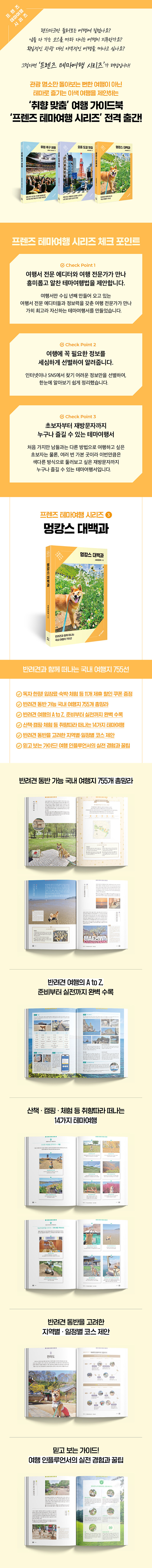 ¡´¸ÛIJ½º ´ë¹é°ú¡µ´Â ¹Ý·Á°ß°ú ÇÔ²² Àü±¹ °÷°÷À» ¿©ÇàÇÏ°í ½ÍÀº ¹Ý·ÁÀεéÀ» À§ÇØ ¼¿ï°æ±âÀÎõÀ» ºñ·ÔÇØ °¿øµµ, ÃæÃ»µµ, Àü¶óµµ, °æ»óµµ, Á¦ÁÖµµ, ¿ï¸ªµµ±îÁö Àü±¹ ÁÖ¿ä ¿©ÇàÁö 755°³¸¦ ÃѸÁ¶óÇÑ °¡À̵åºÏÀÌ´Ù. Áö¿ªº°·Î ¼¼ºÎ ¿©Çà ÄÚ½º¿Í ÇÔ²² ´çÀÏÄ¡±â1¹Ú 2ÀÏ2¹Ú 3ÀÏ µî ÀÏÁ¤¿¡ µû¸¥ ¸ÂÃã ÄÚ½º¸¦ Á¦°øÇÏ¿© ¿©ÇàÀÚµéÀÌ Æí¸®ÇÏ°Ô ÀÏÁ¤À» © ¼ö ÀÖµµ·Ï ±¸¼ºÇß´Ù. °¢ Áö¿ªÀÇ ¸í¼Ò, ½Ä´ç, Ä«Æä, ¼÷¼Ò±îÁö ¼¼¼¼ÇÏ°Ô ¼Ò°³ÇØ ¹Ý·Á°ß°ú ÇÔ²² Àü±¹ ¹æ¹æ°î°îÀ» Áñ±æ ¼ö ÀÖ´Â ¿Ïº®ÇÑ ¾È³»¼´Ù.