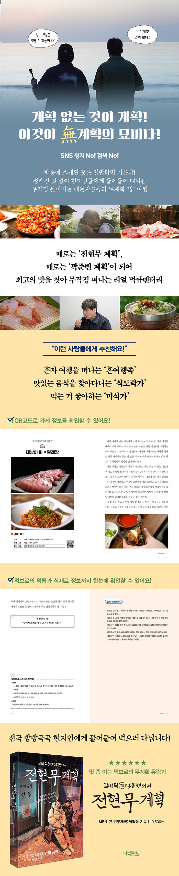 ¡ºÀüÇö¹«°èȹ¡»Àº ±âȹ, ¿¬Ãâ, Ã⿬, ´ëº», Àå¼Ò ¼·¿Ü µî ¸ðµÎ ÀüÇö¹«¿Í °ûÁغóÀÌ ÇØ³ª°¡´Â Àαâ ÇÁ·Î±×·¥À» Ã¥À¸·Î Àçź»ýÇÑ Ã¥ÀÌ´Ù. ¸Ô°Å¸® °¡µæÇÑ ¿ì¸®³ª¶ó Àü±¹ ¹æ¹æ°î°îÀ» ¿ÀÁ÷ ¡®¸À¡¯À» À§ÇØ ¿©ÇàÇÏ¸ç ±× ¼Ó¿¡ ´ã±ä ¸ÀÀº ¹°·Ð, ¿ª»ç¿Í »ç¶÷µéÀÇ À̾߱Ⱑ ´ã°Ü ÀÖ´Ù. ÇÑ ³¢¸¦ ¸Ô¾îµµ Á¦´ë·Î ¸Ô°í ½ÍÀº ¡®ÀüÇö¹«¡¯¿Í Á¤ÇØÁø °É ½È¾îÇÏ´Â ¹«°èȹÀÇ ¹¦¹Ì¸¦ ¾Æ´Â ³²ÀÚ ¡®°ûÁغó¡¯ÀÌ ¼¿ïÀ» ÇʵηΠ°æÀÎ(°æ±â¡¤ÀÎõ), ºÎ»ê, Àü¶ó, °¿ø, °æ»óµµ ¸ÔÆ®¸³À» ¶°³ª¸ç ¸¸³ À½½Ä°ú »ç¶÷, ±×¸®°í ±× ¼Ó¿¡ ±êµç À̾߱⸦ ÆîÃij½ Ã¥ÀÌ´Ù.