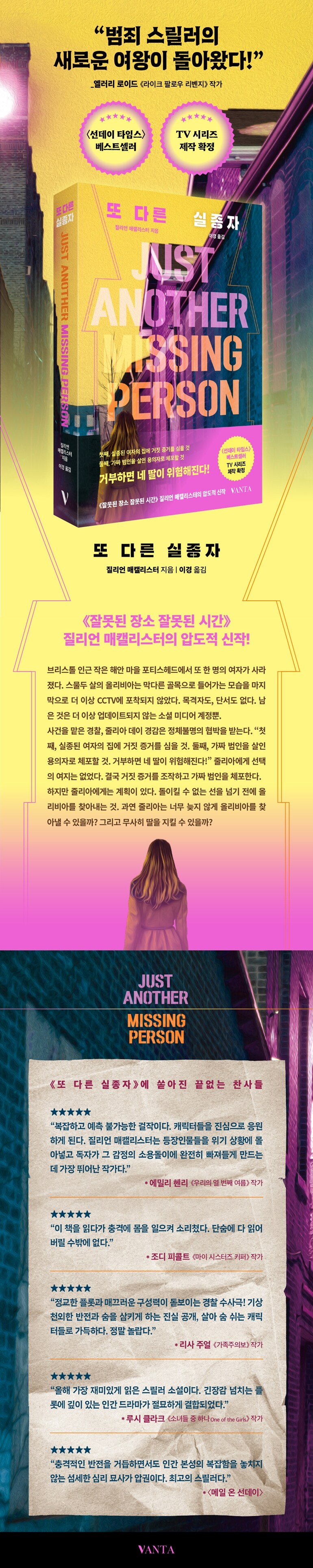 ÀÌ Ã¥ ¡¶¶Ç ´Ù¸¥ ½ÇÁ¾ÀÚ¡·´Â ÀÛ°¡ÀÇ ¿©´ü ¹øÂ° ¼Ò¼³·Î, ¸·´Ù¸¥ °ñ¸ñ ³¡À¸·Î »ç¶óÁø ¿©ÀÚ¸¦ ÃßÀûÇÏ´Â Çü»çÀÇ À̾߱⸦ ´ã¾Ò´Ù. ¼û ½¯ Æ´ ¾øÀÌ ¸ô¾ÆÄ¡´Â Àü°³, ¼¼ Àι°ÀÇ ½ÃÁ¡À» ³Ñ³ªµé¸ç µ¶ÀÚÀÇ ¿¹»óÀ» µÚÈçµå´Â Ä¡¹ÐÇÑ ¹ÝÀü, ±×¸®°í ÀÚ½ÄÀ» ÇâÇÑ ¾ÖƶÇÑ »ç¶ûÀÌ ¾î¿ì·¯Áø ÀÛǰÀÌ´Ù. Ãâ°£ Áï½Ã <¼±µ¥ÀÌ Å¸ÀÓ½º> º£½ºÆ®¼¿·¯¿¡ ¿Ã¶úÀ¸¸ç <¸ÞÀÏ ¿Â ¼±µ¥ÀÌ>, <·¹µå ¸Å°ÅÁø>µî ´Ù¼öÀÇ ¸Åü¿¡¼ ¡°±â¹ßÇÏ°í µ¶Ã¢ÀûÀÌ´Ù¡±, ¡°¼ûÀÌ ¸ÜÀ» µí ³î¶ø´Ù¡± µîÀÇ È£ÆòÀ» ¹Þ¾Ò´Ù. ÇöÀç ¿µ±¹ÀÇ TV µå¶ó¸¶·Î Á¦ÀÛ ÁßÀÌ´Ù.