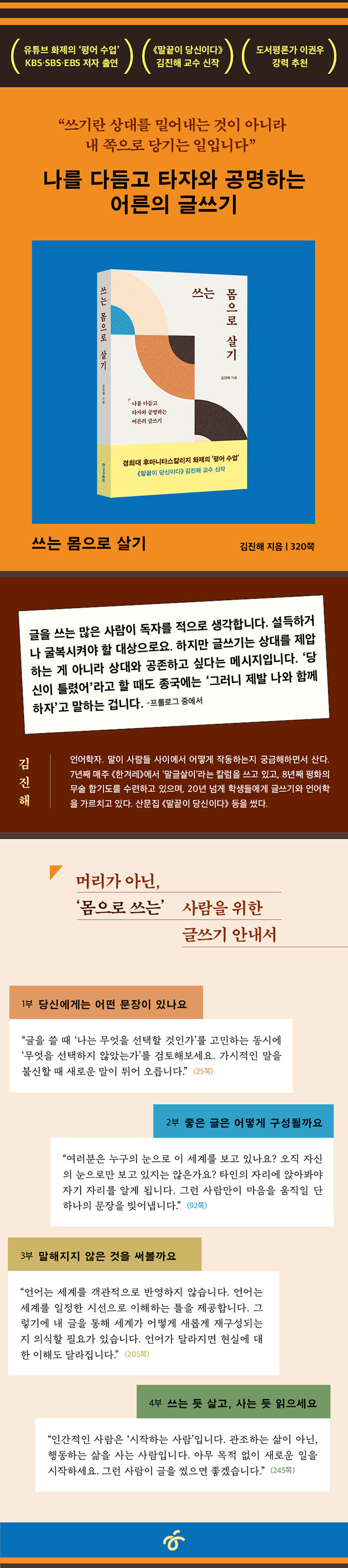 °Àǽǿ¡¼ ¼·Î Æò¾î¸¦ »ç¿ëÇÏ´Â µ¶Æ¯ÇÑ ¼ö¾÷ ¹æ½ÄÀ¸·Î ÈÁ¦µÈ ¾ð¾îÇÐÀÚ ±èÁøÇØ(°æÈñ´ë Èĸ¶´ÏŸ½ºÄ®¸®Áö ±³¼ö)´Â ¾²±â¶õ ¡°»ó´ë¸¦ ¹Ð¾î³»´Â °Ô ¾Æ´Ï¶ó, ³» ÂÊÀ¸·Î ´ç±â´Â ÀÏ¡±(5ÂÊ)ÀÌ¶ó ¸»ÇÑ´Ù. À̹ø ½ÅÀÛ ¡¶¾²´Â ¸öÀ¸·Î »ì±â¡· ¿ª½Ã ³ª¸¦ ´Ùµë°í ŸÀÚ¿Í °ø¸íÇÏ´Â ¡®µÑÀÇ °æÇ衯À¸·Î¼ÀÇ ¾²±â¿¡ ÁÖ¸ñÇÑ´Ù. ¾ð¾îÇÐÀڷμ ´Ù¾çÇÑ ¾ð¾îÀÇ º»¼ºÀ» ¸öÀÇ °¨°¢À¸·Î ¤¾î³»¸ç ±Û¾²±â¿¡ ´ëÇÑ »õ·Î¿î Á¢±ÙÀ» ½ÃµµÇÑ´Ù.