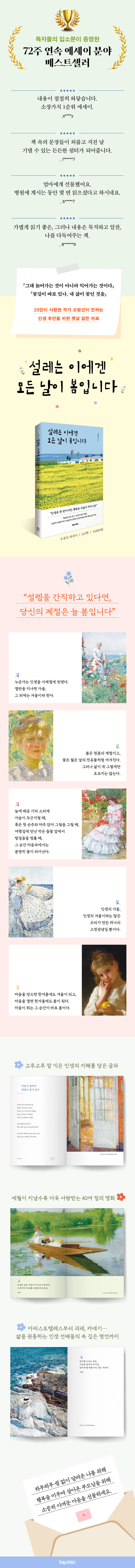 ÇÏ·çÀÇ ½ÃÀÛÀ̳ª ³¡¿¡ ÀÌ Ã¥À» õõÈ÷ ÆîÃ帶ó. ¸¶À½ÀÌ ÁöÃÄ ÀÖÀ» ¶§µµ, ¼¼»óÀÌ Â÷°©°Ô¸¸ ´À²¸Áú ¶§µµ, Ã¥ ¼Ó ¹®ÀåÀº ´ç½Å¿¡°Ô¸¸ ºñÃß´Â º½ ÇÞ»ì °°Àº À§·Î°¡ µÇ¾îÁÙ °ÍÀÌ´Ù. ±× µû½ºÇÔ ¼Ó¿¡¼ Àá½Ã ¼ûÀ» °í¸£°í, ¾ó¾îºÙÀº ¸¶À½À» Ç®¾î³» º¸ÀÚ. ±×·¸°Ô ÀڽŸ¸À» À§ÇØ ¸¶·ÃµÈ ÀÌ ¼±¹° °°Àº ¹®Àå¿¡ ´«±æÀ» ÁÖ°í, ½Ã°£À» ³»¾î ¼Õ±æÀ» °Ç³×±æ ¹Ù¶õ´Ù. ±× ½Ã°£µéÀÌ ½×ÀÌ°í ½×¿©, »îÀº ´õ °ö°Ô À;°í ´Ù½Ã±Ý ¼³·½À¸·Î ²ÉÀ» ÇÇ¿ï °ÍÀÌ´Ù. ±×¸®°í ¸¶Ä§³» ±ú´Ý°Ô µÇ¸®¶ó. ¼³·¹´Â ÀÌ¿¡°Õ, ¸ðµç ³¯ÀÌ º½ÀÓÀ».