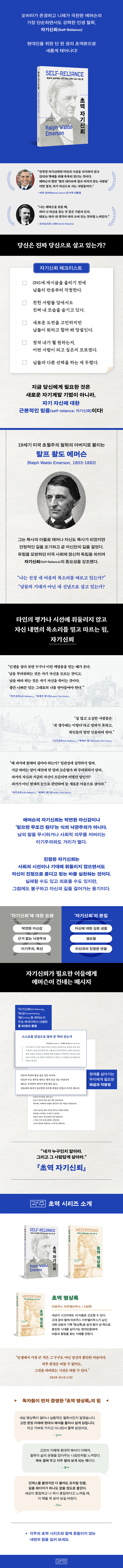 ¿¡¸Ó½¼ÀÇ ´ëÇ¥ÀÛ ¡¸ÀÚ±â½Å·Ú(Self-Reliance)¡¹¸¦ Áß½ÉÀ¸·Î ¡¸º¸»ó(Compensation)¡¹, ¡¸¿ø(Circles)¡¹, ¡¸ÃÊ¿ùÀû ¿µÈ¥(The Over-Soul)¡¹, ¡¸¿µ¿õÀû ÀÚÁú(Heroism)¡¹, ¡¸»ç¶û(Love)¡¹, ¡¸¿¹¼ú(Art)¡¹, ¡¸±æ°¡ÀÇ °íÂûµé(Considerations by the Way)¡¹ µî ±×ÀÇ ÇÙ½É ¿¡¼¼À̵鿡¼ Çö´ëÀο¡°Ô ÇÊ¿äÇÑ ¸Þ½ÃÁö¸¸À» ¾ö¼±ÇØ ´ã¾Ò´Ù. ¿©·¯ ±Û¿¡ Èð¾îÁ® ÀÖ´ø ¿¡¸Ó½¼ÀÇ »çÀ¯¸¦ ¡®ÀÚ±â½Å·Ú¡¯¶ó´Â ÇϳªÀÇ ÁÖÁ¦·Î ü°èÈÇÏ¿©, ÀڽŸ¸ÀÇ ±æÀ» °É¾î°¡´Â ¿ë±â°¡ ÇÊ¿äÇÑ ¸ðµç À̵éÀ» À§ÇÑ ½Ç¿ëÀû ÀλýöÇÐÀ¸·Î À籸¼ºÇß´Ù.