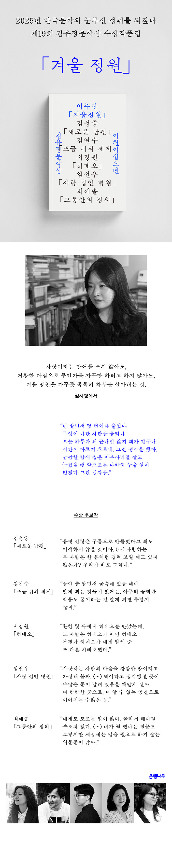 ÀÌÁÖ¶õÀÇ ¡¸°Ü¿ï Á¤¿ø¡¹ÀÌ 2025 Á¦19ȸ ±èÀ¯Á¤¹®Çлó ¼ö»óÀÛÀ¸·Î ¼±Á¤µÇ¾ú´Ù. ¼Ò¼³°¡ ±èÀ¯Á¤À» ±â¸®¸ç Áö³ ÇÑ ÇØ µ¿¾È ¹®¿¹Áö¿¡ ¹ßÇ¥µÈ Áß, ´ÜÆí¼Ò¼³À» ´ë»óÀ¸·Î ¶Ù¾î³ ÀÛǰÀ» ¼±º°Çؿ ±èÀ¯Á¤¹®ÇлóÀº Çѱ¹¹®ÇÐÀÇ ÀÇ¹Ì ÀÖ´Â È帧À» È®ÀÎÇÒ ¼ö ÀÖ´Â ÀÌÁ¤Ç¥ °°Àº ¿ªÇÒÀ» ÇØ¿Ô´Ù. ¿ÃÇØ ±èÀ¯Á¤¹®ÇлóÀº Çϼº¶õ(¼Ò¼³°¡), ÃÖ¼öö(¼Ò¼³°¡), À̰æÀç(¹®ÇÐÆò·Ð°¡), Àξƿµ(¹®ÇÐÆò·Ð°¡)ÀÌ ¿¹¡¤º»½É ÅëÇÕ ½É»ç¸¦ ¸Ã¾Æ ÁøÇàÇß°í, Ä¡¿ÇÑ ³íÀÇ ³¡¿¡ ÀÌÁÖ¶õÀÇ ¡¸°Ü¿ï Á¤¿ø¡¹À» ¼ö»óÀÛÀ¸·Î ¼±Á¤Çß´Ù. ¿¹¼ø »ì ¿©¼º Çý¼÷ÀÇ ¼Ò¼ÒÇÑ ÀÏ»óÀ» ±×¸®°í ÀÖ´Â ¼ö»óÀÛ ¡¸°Ü¿ï Á¤¿ø¡¹Àº ÀÏ»óÀÇ ¾Æ¹« Àϵµ ÀϾÁö ¾Ê´Â °Íó·³ º¸ÀÌ´Â ÇÑ »î¿¡ ¾ó¸¶³ª ¸¹Àº »ç¶û°ú ½½ÇÄÀÌ Ãâ··À̰í ÀÖ´ÂÁö¸¦ Àß º¸¿©ÁÖ°í ÀÖ´Â ¼Ò¼³ÀÌ´Ù. º°´Ù¸¥ ÀÇ¹Ì ¾øÀÌ ¡®±×³É¡¯ »ì¾Æ°¡´Â »ç¶÷µéÀÇ ¼ö¸¹Àº ½½Çİú ¿ôÀ½, ÈÄȸ ±×¸®°í ±×¸®¿òÀÌ ÀýÁ¦µÈ °¨Á¤°ú ÅæÀ¸·Î ±×·ÁÁø ¼öÀÛÀÌ´Ù. ÇÔ²² ½Ç¸° ¼ö»ó Èĺ¸ÀÛ ±è¼ºÁßÀÇ ¡¸»õ·Î¿î ³²Æí¡¹, ±è¿¬¼ö ¡¸Á¶±Ý µÚÀÇ ¼¼°è¡¹, ¼Àå¿øÀÇ ¡¸È÷µ¥¿À¡¹, ÀÓ¼±¿ìÀÇ ¡¸»ç¶û Á¢ÀÎ º´¿ø¡¹, ÃÖ¿¹¼Ö ¡¸±×µ¿¾ÈÀÇ Á¤ÀÇ¡¹ µî ´Ù¼¸ ÆíÀÇ ÀÛǰÀ» ÅëÇØ ÇöÀç ¿ì¸® »çȸ¸¦ °üÅëÇÏ´Â Áß¿äÇÏ°í ´Ù¾çÇÑ È帧À» ¹®ÇÐÀûÀ¸·Î ¤¾îº¼ ¼ö ÀÖ´Â ±âȸ°¡ µÉ °ÍÀÌ´Ù.
