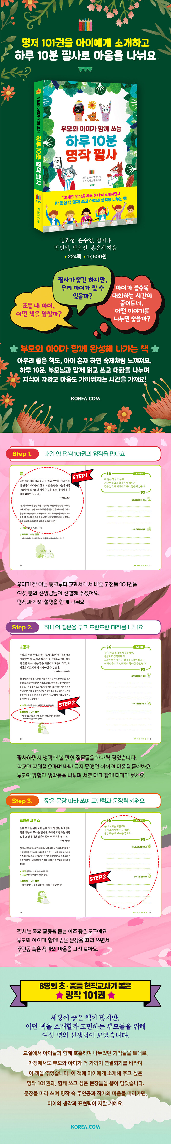 ÇÏ·ç 10ºÐ, ³» ¾ÆÀÌ¿¡°Ô ¸íÀÛ ¼Ó ¹®ÀåÀ» ¼Ò°³ÇÏ¸é¼ À̾߱⺸µû¸®¸¦ Ç®¾î º¸¼¼¿ä. ÀÌ Ã¥Àº ¶Ç¹Ú¶Ç¹Ú ¹®ÀåÀ» µû¶ó ¾²¸é¼ ¸íÀÛ ¼Ó Àι°µéÀÇ ½Ã¼±À» µû¶ó°¡µµ·Ï ¾È³»ÇÕ´Ï´Ù. ¾ÆÀÌ¿Í ÇÔ²² ºÎ¸ð´Ôµµ Çʻ翡 Âü¿©ÇÏ¿© °°Àº ÁÖÁ¦ÀÇ À̾߱⸦ ³ª´ ¼ö ÀÖ¾î¿ä. ÀÌ Ã¥¿¡´Â 101±ÇÀÇ ¸íÀÛÀÌ ¼Ò°³µÇ¾î ÀÖ½À´Ï´Ù. ¿ì¸®°¡ Àß ¾Æ´Â µ¿ÈºÎÅÍ ±³°ú¼¿¡¼ ¹è¿ü´ø °íÀüµé, ÀÍÈ÷ Àß ¾Æ´Â ÀÛ°¡ÀÇ Ã¥ µî 101±ÇÀ» ¼±º°ÇÏ¿´¾î¿ä. 6¸íÀÇ ¼±»ý´ÔµéÀÌ ¸íÀÛÀÇ ÁÖ¿ä ³»¿ëÀ» ¼³¸íÇϰí, ÇÔ²² ³ª´©°í ½ÍÀº ¹®ÀåÀ» ¼Ò°³Çϰí, ¹®ÀåÀÇ Àǹ̸¦ Ç®¾îµÎ¾ú½À´Ï´Ù.
