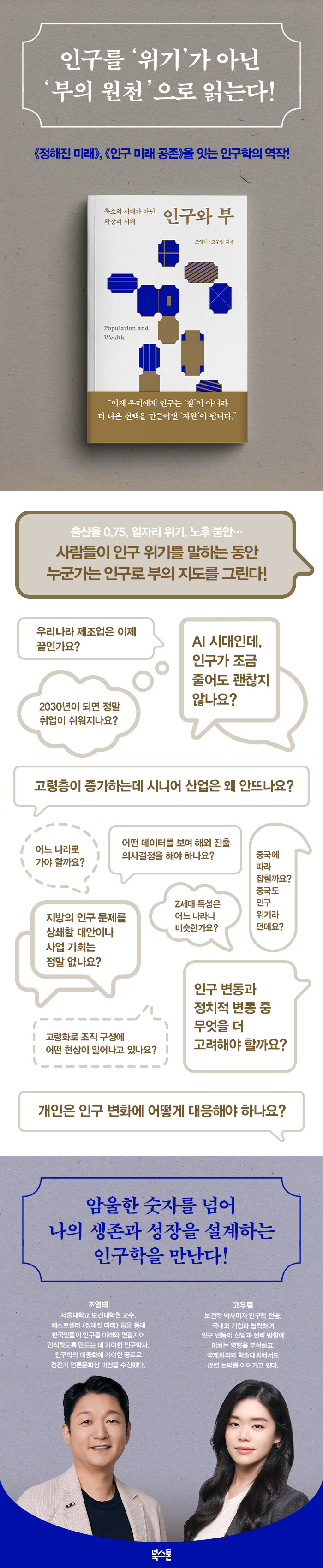 Àα¸´Â ¹Ì·¡¸¦ »ó»óÇÒ ¼ö ÀÖ´Â °¡Àå Çö½ÇÀûÀÎ ±Ù°ÅÀÌÀÚ, ºÒÈ®½ÇÇÑ ½Ã´ë¿¡ ºÎ¸¦ È®ÀåÇÏ´Â Àü·«ÀÇ Åä´ë´Ù. ±×·¯³ª ±×µ¿¾È ¿ì¸®´Â Àα¸¸¦ À§±âÀÇ ¾ð¾î·Î¸¸ ¹Þ¾ÆµéÀÌ°í µ¥ Àͼ÷Çß´Ù. ÀÌ Ã¥Àº Àα¸¸¦ ¡®ºÎ¡¯ÀÇ ¾ð¾î·Î Àд ¹ýÀ» ¾Ë·ÁÁØ´Ù. Çѱ¹À» ´ëÇ¥ÇÏ´Â Àα¸ÇÐÀÚ Á¶¿µÅ ±³¼ö´Â Çѱ¹ÀÌ °Þ°í ÀÖ´Â ¡®Ãâ»êÀ² À§±â¡¯ ´ã·ÐÀ» ³Ñ¾î, Àα¸ ±¸Á¶ÀÇ º¯È°¡ »õ·Î¿î ºÎÀÇ ±âȸ¸¦ ¸¸µç´Ù´Â ±Ù°Å¸¦ Á¦½ÃÇÑ´Ù. ±×·³À¸·Î½á ´ÜÆíÀûÀÎ À§±â Á¶ÀåÀ̳ª ±Ù°Å ¾ø´Â ³«°üÀÌ ¾Æ´Ñ, ´õ ³ªÀº ¼±ÅÃÀ» ¸¸µé¾î³»´Â Àα¸ Àü·«À» Á¦½ÃÇÑ´Ù. ÀÌÁ¦ ¡®¼Ò¸ê¡¯ÀÇ ÁöÇ¥°¡ ¾Æ´Ï¶ó, ¹Ì·¡¸¦ ¼³°èÇÏ´Â ¡®Áöµµ¡¯·Î¼ Àα¸¸¦ ¹Ù¶óº¸ÀÚ.