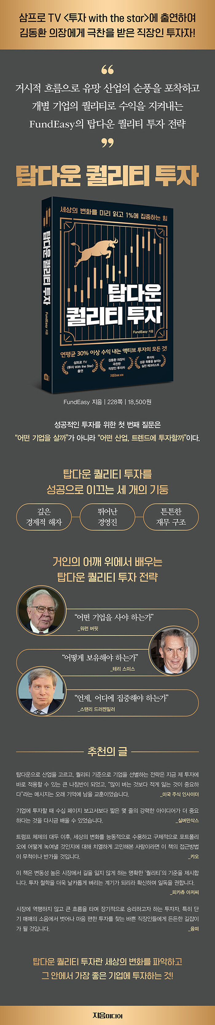 ÀÌ Ã¥Àº ¡®Å¾´Ù¿î(Top-down)¡¯À¸·Î »ê¾÷ÀÇ Å« È帧À» Àаí, ¡®Ä÷¸®Æ¼(Quality)¡¯ ±âÁØÀ¸·Î ÃÖ°íÀÇ ±â¾÷À» ¼±º°ÇÏ´Â Àü·«À» ±¸Ã¼ÀûÀ¸·Î Á¦½ÃÇÑ´Ù. ¿ö·± ¹öÇÍ, Å׸® ½º¹Ì½º, µå·¯Ä˹з¯ µî ÅõÀÚ ´ë°¡µéÀÇ Ã¶ÇÐÀ» Çѱ¹ ÅõÀÚÀÚÀÇ ´«³ôÀÌ¿¡ ¸Â°Ô ÀçÇØ¼®ÇÏ¸ç ¡®ÁÁÀº À繫¡¯, ¡®Æ°Æ°ÇÑ ÇØÀÚ(Moat)¡¯, ¡®Å¹¿ùÇÑ °æ¿µÁø¡¯À̶ó´Â ¼¼ °¡Áö ±âÁØÀ¸·Î ÁøÂ¥ ¿ì·® ±â¾÷À» °¡·Á³»´Â ¹æ¹ýÀ» ¾Ë·ÁÁØ´Ù.