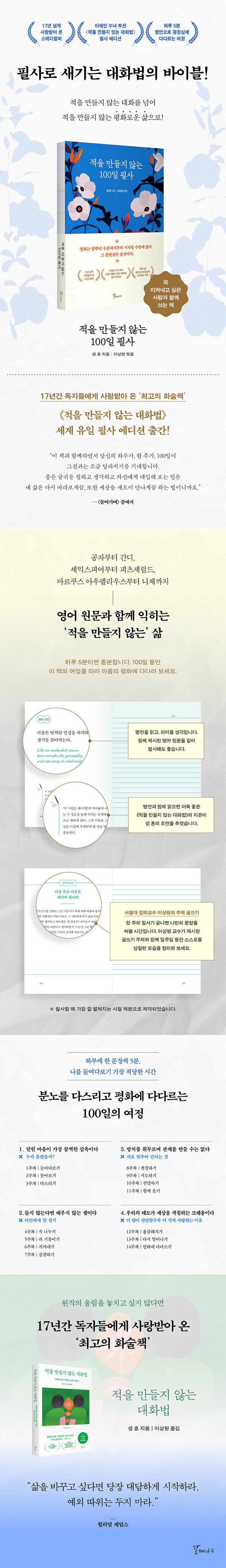 ¡¶ÀûÀ» ¸¸µéÁö ¾Ê´Â 100ÀÏ Çʻ硷´Â ´Ü¼øÇÑ ¸í¾ð Çʻ翡 ±×Ä¡Áö ¾Ê´Â´Ù. ¼ö·ÏµÈ ¸í¾ðÀÇ ¿µ¹®À» ÇÔ²² ½Ç¾î ¿ø¹®ÀÇ ±íÀ̱îÁö À½¹ÌÇØ º¼ ¼ö ÀÖµµ·Ï ÇßÀ¸¸ç, ¡¶ÀûÀ» ¸¸µéÁö ¾Ê´Â ´ëȹý¡· ÀúÀÚ »ù È¥ÀÌ ÅëÂûÇÑ ´ëÈÀÇ ÇÊ»ì±â¸¦ ¹ßÃéÇØ µ¡ºÙ¿©¼ ¸í¾ðÀÇ °¨µ¿ÀÌ ½Ç»ýȰ°ú À̾îÁú ¼ö ÀÖ°Ô ÇÑ °Í ¿ª½Ã ÀÌ Ã¥ÀÇ Å« ÀåÁ¡ÀÌ´Ù.
