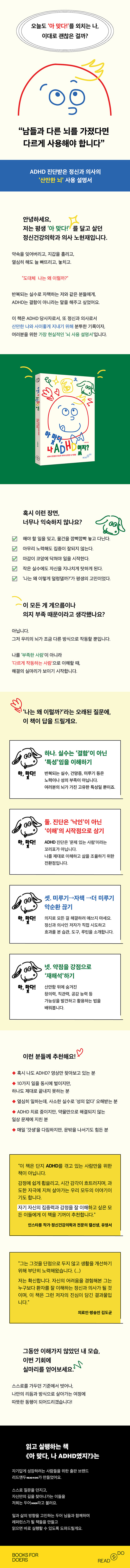 ¡º¾Æ ¸Â´Ù, ³ª ADHD¿´Áö?¡»´Â ADHD Áø´Ü ÀÌÈÄÀÇ ±¸Ã¼ÀûÀÎ »ýȰ Àü·«À» Á¦½ÃÇÑ´Ù. ¡®¾àÀ» ¸ÔÀ» °ÍÀΰ¡ ¸» °ÍÀΰ¡¡¯ÀÇ À̺йýÀû Á¢±ÙÀ» ³Ñ¾î¼, ¸Þ¸ð ½À°ü, ¾Ë¶÷ ¼³Á¤, ÀÏÁ¤ °ü¸®, °¨Á¤ Á¶Àý¹ý µî ÀúÀÚ°¡ ½ÇÁ¦·Î ½ÃµµÇϰí È¿°ú¸¦ º» Çö½ÇÀûÀÎ µµ±¸µéÀ» ¼Ò°³ÇÑ´Ù. ÀÌ Ã¥Àº ´Ü¼ø Á¤º¸¸¦ ³Ñ¾î ¡®ÀÚ±â ÀÚ½ÅÀ» ÀÌÇØÇÏ·Á´Â ³ë·Â¸¸À¸·Îµµ ¿ì¸®´Â ÃæºÐÈ÷ Àß »ì¾Æ°¡°í ÀÖ´Ù¡¯´Â µû¶æÇÑ ¸Þ½ÃÁö¸¦ ÀüÇÑ´Ù. ÀÚ½ÅÀÇ ¹Ýº¹µÇ´Â ½Ç¼ö¸¦ ´Ù½Ã µé¿©´Ùº¸°í ½ÍÀº »ç¶÷, ADHD¸¦ ÀǽÉÇϸ鼵µ È¥¶õ½º·¯¿î °¨Á¤¿¡ ¸Ó¹°·¯ ÀÖ´Â »ç¶÷, ±×¸®°í Áø´Ü ÀÌÈÄ »îÀÇ Àü·«ÀÌ ÇÊ¿äÇÑ »ç¶÷¿¡°Ô ²À ÇÊ¿äÇÑ Çö½ÇÀûÀÎ ±æÀâÀÌ´Ù.