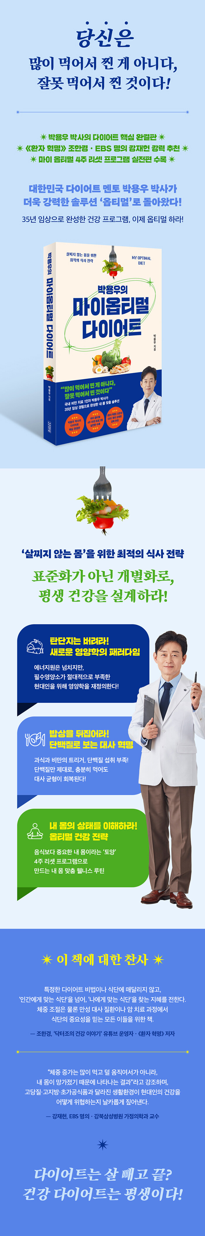 ¸¹ÀÌ ¸Ô¾î¼ Âð °Ô ¾Æ´Ï¶ó, À߸ø ¸Ô¾î¼ Âð °ÍÀÌ´Ù! ±¹³» ºñ¸¸ Ä¡·áÀÇ ÃÖ°í ±ÇÀ§ÀÚÀÌÀÚ, 35³â°£ 2¸¸¿© ¸íÀÌ ³Ñ´Â ȯÀÚ¸¦ Áø·áÇØ¿Â ¹Ú¿ë¿ì ¹Ú»ç°¡ ÇÑÃþ ¾÷±×·¹À̵åµÈ ´ÙÀÌ¾îÆ® ¼Ö·ç¼Ç ¡¶¹Ú¿ë¿ìÀÇ ¸¶ÀÌ ¿ÉƼ¸Ö ´ÙÀÌ¾îÆ®¡··Î µ¹¾Æ¿Ô´Ù. ±×µ¿¾È ¼ö¸¹Àº µ¶ÀÚ¿Í È¯ÀÚµéÀ» ºñ¸¸¿¡¼ ÇØ¹æ½ÃŰ¸ç ¡®´ëÇѹα¹ ´ÙÀÌ¾îÆ® ¸àÅ䡯·Î ÀÚ¸®¸Å±èÇØ¿Â ±×°¡ ½ÄŹ Çõ¸íÀ» Á¦¾ÈÇÑ´Ù. ¸ðµÎ¿¡°Ô ¶È°°ÀÌ Àû¿ëµÇ´Â Ç¥ÁؽÄÀÌ ¾Æ´Ï¶ó, °¢ÀÚÀÇ ´ë»ç »óÅ¡¤Ã¼Áú¡¤»ýȰ½À°ü¿¡ ¸ÂÃá °³º°ÈµÈ °Ç° Àü·« ¿ÉƼ¸Ö! ´Ü¼øÈ÷ »ìÀ» »©´Â ±â¼úÀÌ ¾Æ´Ï¶ó Áö¹æ°£, Àν¶¸° ÀúÇ×¼º, ¸¸¼º ¿°ÁõÀ» ¹Ù·ÎÀâ´Â ´ë»ç Ä¡·áºÎÅÍ ½º½º·Î °Ç°À» µÇã´Â °úÇÐÀû ¹æ¹ý·Ð±îÁö, »ìÂîÁö ¾Ê´Â °Ç°ÇÑ ¸öÀ» À§ÇÑ ÇÙ½É Á¤º¸¸¦ ÃѸÁ¶óÇß´Ù. ÀÌÁ¦ Ç¥ÁØÈ°¡ ¾Æ´Ñ °³º°È·Î, Æò»ý °Ç°À» ¼³°èÇ϶ó.