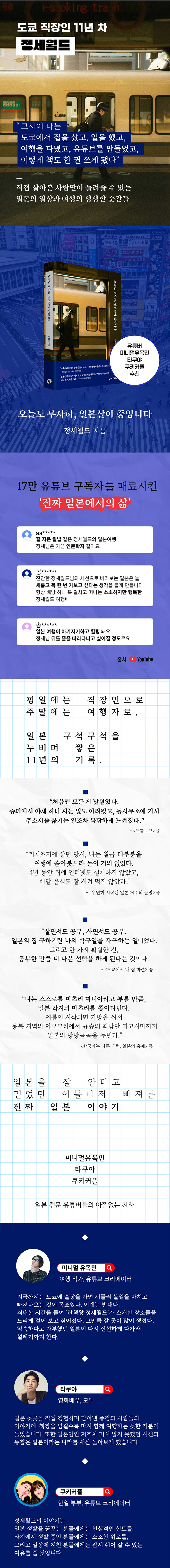 ÀϺ» µµÄì¿¡¼ 11³â° »ì°í ÀÖ´Â Á÷ÀåÀÎÀÌÀÚ À¯Æ©ºê ä³Î 'Á¤¼¼¿ùµå' ÁÖÀÎÀå. ÆòÀÏ¿¡´Â Á÷ÀåÀÎÀ¸·Î, ÁÖ¸»¿¡´Â ¿©ÇàÀÚ·Î ÀϺ» ±¸¼®±¸¼®À» ´©ºñ¸ç Áö³½´Ù. µµÄì¿¡ ÁýÀ» »ê Çö½ÇÁÖÀÇÀÚÀ̸鼵µ, ±Ý¿äÀÏ ¹ã¸¶´Ù ¾îµð·Î ¶°³¯Áö °í¹ÎÇÏ¸ç ½É¾ß ¹ö½º Á¤·ùÀå°ú ±âÂ÷¿ªÀ» ¾î½½··°Å¸®´Â ³¶¸¸ÁÖÀÇÀÚÀ̱⵵ ÇÏ´Ù. 17¸¸ ¸íÀÌ ±¸µ¶ÇÏ´Â À¯Æ©ºê ä³Î 'Á¤¼¼¿ùµå'¿¡¼ Çö½ÇÀûÀÎ ÀϺ» »ýȰ Á¤º¸¿Í ¼û°ÜÁø ¼Òµµ½Ã dz°æÀ» ƯÀ¯ÀÇ Áø¼ÖÇÑ ½Ã¼±À¸·Î ±â·ÏÇϸç 'ÁøÂ¥ ÀϺ»¿¡¼ÀÇ »î'À» ÀüÇϰí ÀÖ´Ù.