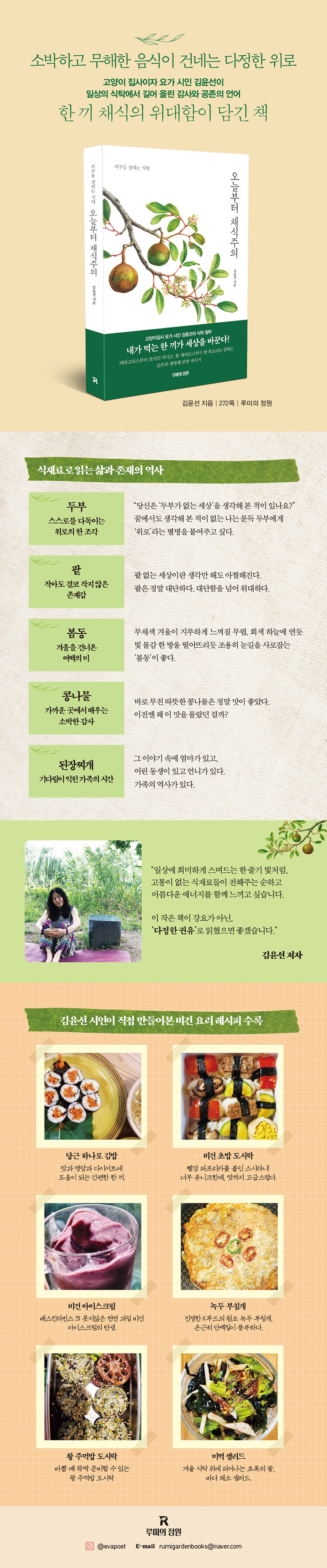 ÀÌ Ã¥Àº ´Ü¼øÇÑ ·¹½ÃÇÇ ¸ðÀ½ÀÌ ¾Æ´Ï´Ù. Àͼ÷ÇÑ ½ÄÀç·á ÇϳªÇϳª¿¡ ´ã±ä ÀúÀÚÀÇ ¾î¸° ½ÃÀý Ãß¾ï, ºñ°Ç(Vegan)À¸·Î »ì¾Æ°¡¸ç ¸¶ÁÖÇÑ ±ú´ÞÀ½, ±×¸®°í À½½Ä°ú ¾ôÈù »çȸ¡¤¿ª»çÀû Àṉ̀îÁö Æø³Ð°Ô ´Ù·é´Ù. ±æ°í¾çÀÌ µ¹º¸´Â ÀÏ, Ãà»ê¾÷ÀÇ À̸é, µ¿¹° ½ÇÇè µî »ý¸í Á¸Áß°ú À±¸®Àû ¼Òºñ¿¡ ´ëÇÑ ±íÀº ¼ºÂûÀ» ÆîÃÄ º¸ÀδÙ. ¡®µÎºÎ¡¯¿Í ¡®³ìµÎ¡¯, ¡®ÆÏ¡¯, ¡®º½µ¿¡¯, ¡®´ç±Ù¡¯, ¡®¹Ì¿ª¡¯, ¡®Äᳪ¹°¡¯, ¡®µÈÀåÂî°³¡¯, ¡®±èÀ塯, ¡®¹Ù³ª³ª¡¯ µî ¿ì¸® ÁÖº¯¿¡¼ ½±°Ô ¸¸³ª´Â ½ÄÀç·á°¡ ÀúÀÚ¸¸ÀÇ ½Ã¼±À¸·Î »õ·Ó°Ô žÙ. ´Ü¼øÈ÷ ¿ä¸®¹ýÀ» ¼Ò°³ÇÏ´Â µ¥ ±×Ä¡Áö ¾Ê°í, °¢ ½ÄÀç·á°¡ °¡Áø °íÀ¯ÇÑ Æ¯Â¡°ú À̸¦ ÅëÇØ ¾òÀº ÀλýÀÇ ÀÛÀº ±³ÈÆÀ» ¼¶¼¼ÇÏ°Ô Æ÷ÂøÇØ ³½´Ù.