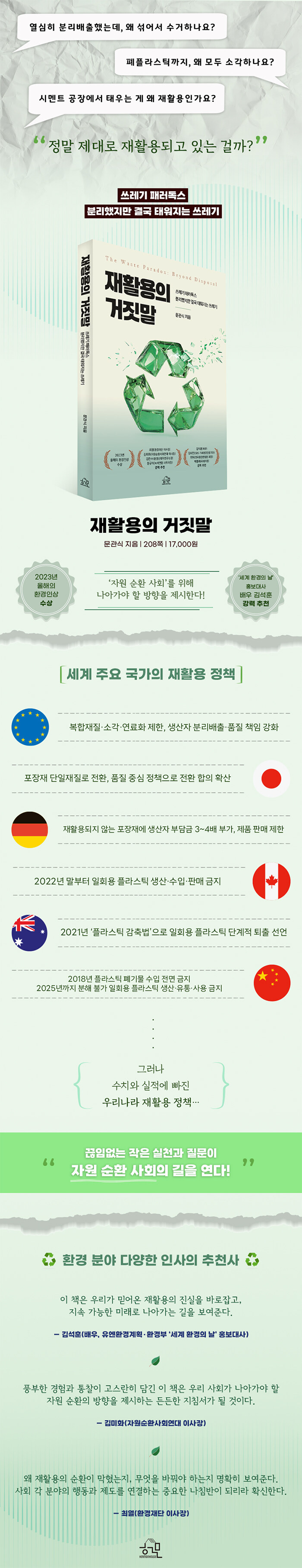 ÀÌ Ã¥Àº ¿ì¸®°¡ ½ñ¾Æ¿Â ºÐ¸®¹èÃâÀÇ ³ë·ÂÀÌ ÇêµÇÁö ¾Êµµ·Ï, ¹«¾ùÀ» °íÃÄ¾ß ÇÏ´ÂÁö, Á¦µµ¿Í Á¤Ã¥, ±×¸®°í »çȸÀû ÇÕÀÇÀÇ »õ·Î¿î ¹æÇâÀ» Á¦¾ÈÇÑ´Ù. ¡ºÀçȰ¿ëÀÇ °ÅÁþ¸»¡»Àº ÀçȰ¿ë ½Åȸ¦ ÇØÃ¼Çϰí, Áö¼Ó °¡´ÉÇÑ ¼øÈ¯°æÁ¦·Î °¡±â À§ÇÑ Ã¹°ÉÀ½À» Á¦½ÃÇϴ åÀÌ´Ù.