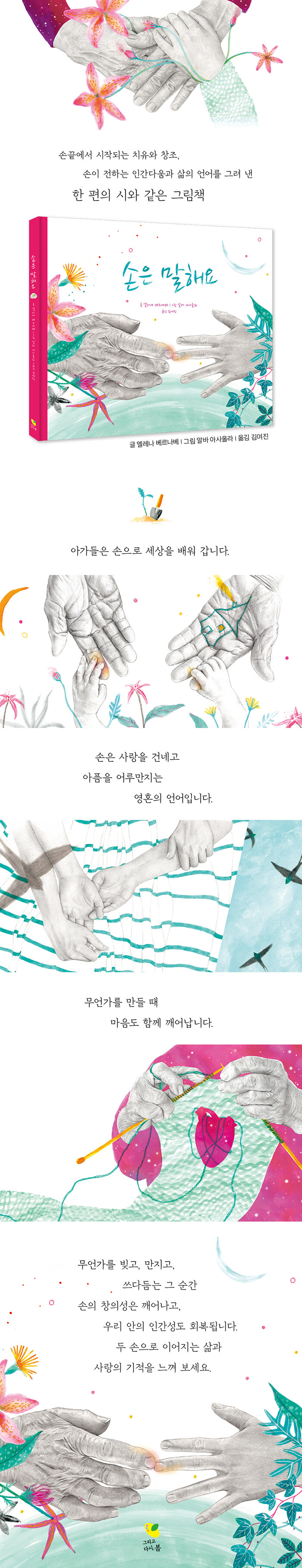 ¡¶¼ÕÀº ¸»Çؿ䡷´Â ¿ì¸®°¡ ¹«½ÉÈ÷ Áö³ªÃÆ´ø ¼Õ¿¡ ±Í ±â¿ïÀÌ°Ô ÇÏ´Â ±×¸²Ã¥ÀÔ´Ï´Ù. ¼Õ¿¡ ´ã±ä µû¶æÇÔ°ú ÈûÀ» »õ·Ó°Ô ºñÃä´Ï´Ù. Á¶±×¸¸ ¼ÕÀ» Á¶¸ô¶ô´ë¸ç ¼¼»óÀ» ¹è¿ö °¡´Â ¾Æ±âÀÇ ¼Õ, »ç¶ûÇÏ´Â ¿¬ÀÎÀÌ ¸ÂÀâÀº ¼Õ, ÀåÀÎÀÇ ¼Õ³¡¿¡¼ ¿Ï¼ºµÇ´Â ÀÛǰ µî ¿ì¸®´Â ¼ÕÀ» ÅëÇØ ¹è¿ì°í, »ç¶ûÇϰí, ¼¼»ó°ú ¿¬°áµË´Ï´Ù. ÀÌ Ã¥Àº ¼ÕÀ̶ó´Â Æò¹üÇÑ Á¸Àç ¾È¿¡ ±êµç ³î¶ó¿î À̾߱⸦ ½ÃÀûÀÎ ¾ð¾î¿Í °¨°¢ÀûÀÎ ±×¸²À¸·Î Ç®¾î³»¸ç, Àϻ󿡼 ¿ì¸®°¡ ³õÄ¡°í ÀÖ´ø ¡®Àΰ£´Ù¿ò¡¯À» ¼¶¼¼ÇÏ°Ô Àϱú¿ö ÁÝ´Ï´Ù. ¡¶¼ÕÀº ¸»Çؿ䡷´Â ¼ÕÀ» ÅëÇØ Àΰ£´ä°Ô »ì¾Æ°£´Ù´Â °ÍÀÌ ¹«¾ùÀÎÁö, ¾î¶»°Ô ¼·Î¸¦ À̾î ÁÖ¸ç ´õ µû¶æÇÑ ¼¼»óÀ» ¸¸µé¾î °¥ ¼ö ÀÖ´ÂÁö ¹¯½À´Ï´Ù. ±×·¯¸é ¿ì¸®´Â ÀÚ¿¬½º·´°Ô ³ªÀÇ µÎ ¼ÕÀ» ³»·Á´Ùº¸¸ç ¼ÕÀÌ °¡Áø ½Åºñ¿Í ÈûÀ» ¹ß°ßÇÏ°Ô µÉ °ÍÀÔ´Ï´Ù.