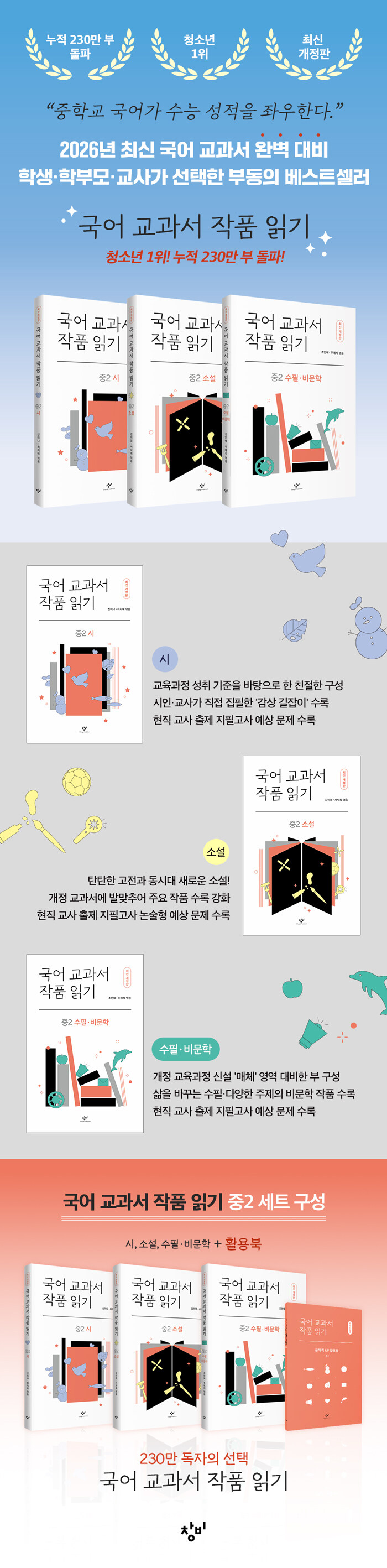 2022 °³Á¤ ±³À°°úÁ¤¿¡ µû¶ó 2026³âºÎÅÍ ÁßÇб³ 2Çгâ ÇлýµéÀº »õ ±³°ú¼·Î °øºÎÇÑ´Ù. Áß2 ±¹¾î ±³°ú¼ 10Á¾ ÃÑ 20±Ç¿¡ ¼ö·ÏµÈ ¸ðµç ÀÛǰÀ» ½ÃÀΰú ÇöÁ÷ ±¹¾î ±³»çµéÀÌ ²Ä²ÄÈ÷ ÀÐ°í ºÐ¼®Çß´Ù. 10Á¾ ±³°ú¼¿¡¼ ÇлýµéÀÌ Çʼö·Î Àоî¾ß ÇÏ´Â ÀÛǰÀ» °¡·Á »Ì°í, ±³°ú¼ ¹ÛÀÇ ÇÙ½É ÀÛǰÀ» ´õÇØ ½Ã 42Æí, ¼Ò¼³ 8Æí, ¼öÇÊ¡¤ºñ¹®ÇÐ 29ÆíÀ» ¼ö·ÏÇß´Ù.