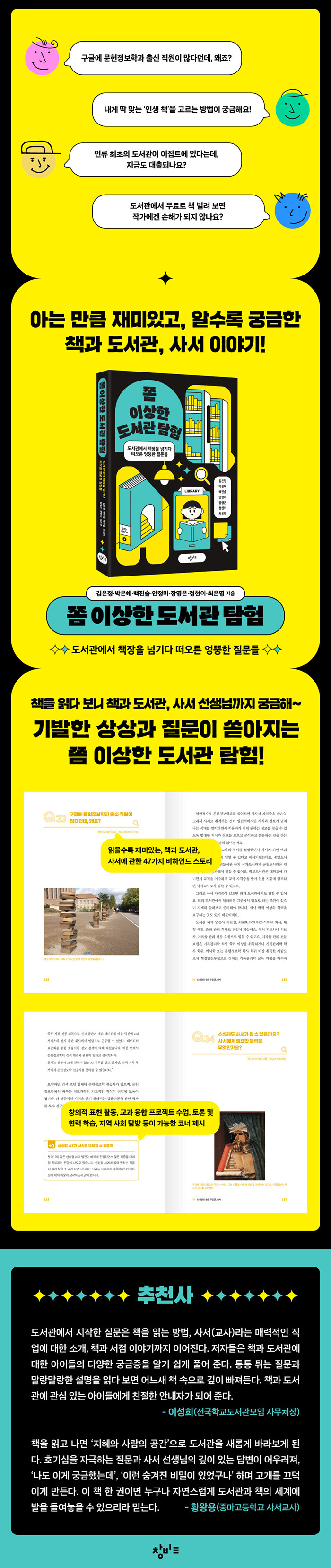 »ç¼±³»ç¿Í »ç¼°¡ ÇÔ²² ¾´ ÀÌ Ã¥Àº ÀúÀÚµéÀÇ ÇöÀå °æÇèÀ» ¹ÙÅÁÀ¸·Î ¡°±¸±Û¿¡ ¹®ÇåÁ¤º¸Çаú Ãâ½Å Á÷¿øÀÌ ¸¹´Ù´øµ¥, ¿ÖÁÒ?¡±, ¡°Àηù ÃÖÃÊÀÇ µµ¼°üÀÌ ÀÌÁýÆ®¿¡ Àִٴµ¥, Áö±Ýµµ ´ëÃâµÇ³ª¿ä?¡±, ¡®µµ¼°ü¿¡¼ ¹«·á·Î Ã¥ ºô·Á º¸¸é ÀÛ°¡¿¡°Õ ¼ÕÇØ°¡ µÇÁö ¾Ê³ª¿ä?¡¯¿Í °°Àº ÇлýµéÀÇ ¾û¶×ÇÏÁö¸¸ Áß¿äÇÑ Áú¹®¿¡ ´äº¯ÇÏ¸ç µµ¼°üÀ» ÀÌ·ç´Â Èï¹Ì·Î¿î ¼¼°è¸¦ ޱ¸ÇÑ´Ù. ÇÑ ²ÀÁö°¡ ³¡³ª¸é Àι®¡¤»çȸ¡¤¹®ÈÀû °üÁ¡¿¡¼ »ý°¢À» È®ÀåÇÒ ¼ö ÀÖ´Â Áú¹®À» µ¡ºÙ¿©, ±³½Ç°ú µµ¼°ü¿¡¼ ÇÔ²² À̾߱⠳ª´©±â¿¡ ÀûÇÕÇϵµ·Ï ±¸¼ºÇß´Ù. ¿µ¿ªÀ» ³Ñ³ªµå´Â Áú¹®¿¡ ´äÀ» ã¾Æ°¡´Ù º¸¸é ÀÚ¿¬½º·´°Ô »ç°í¸¦ ³ÐÈú ¼ö ÀÖÀ» °ÍÀÌ´Ù. ±â¹ßÇÑ Áú¹®°ú »ó»óÀÌ ½ñ¾ÆÁö´Â µµ¼°ü ¼ö¾÷À» ²Þ²Ù´Â ±³»çµé, ±×¸®°í µµ¼°ü¿¡¼ ¼¼»óÀ» ޱ¸ÇÏ°í ½ÍÀº û¼Ò³âµé¿¡°Ô ÀÌ Ã¥Àº µçµçÇÑ ±æÀâÀ̰¡ µÇ¾î ÁÙ °ÍÀÌ´Ù.