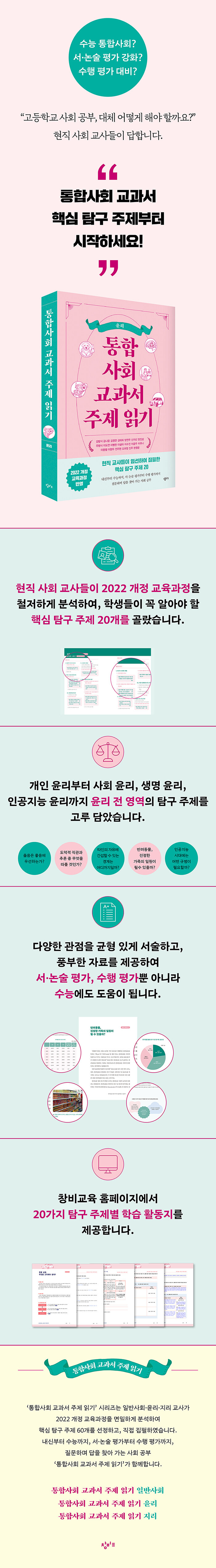 2022 °³Á¤ ±³À°°úÁ¤À» ¹Ý¿µÇÑ ¡®ÅëÇÕ»çȸ ±³°ú¼ ÁÖÁ¦ Àб⡯ ½Ã¸®Áî´Â ±³À°°úÁ¤°ú ÅëÇÕ»çȸ ±³°ú¼¿¡¼ ±æ¾î ³½ ÇÙ½É Å½±¸ ÁÖÁ¦¸¦ ´Ù·é´Ù. ÀϹݻçȸ¡¤À±¸®¡¤Áö¸® ±³»çµéÀÌ Çб³ ÇöÀåÀÇ °æÇè°ú ±³°úÀÇ Àü¹®¼ºÀ» »ì·Á ±³À°°úÁ¤À» ¸é¹ÐÇÏ°Ô ºÐ¼®ÇØ Á÷Á¢ ÁÖÁ¦¸¦ ¼±Á¤ÇÑ ´ÙÀ½, ±³°ú ³»¿ëÀ» ±¸Ã¼ÀûÀÎ »îÀÇ ¸Æ¶ô¿¡ Àû¿ëÇÏ¿© »çȸ ¹®Á¦¸¦ ÆÄ¾ÇÇϰí ÇØ°á ¹æ¾ÈÀ» °í¹ÎÇØ º¼ ¼ö ÀÖµµ·Ï ÁýÇÊÇß´Ù.