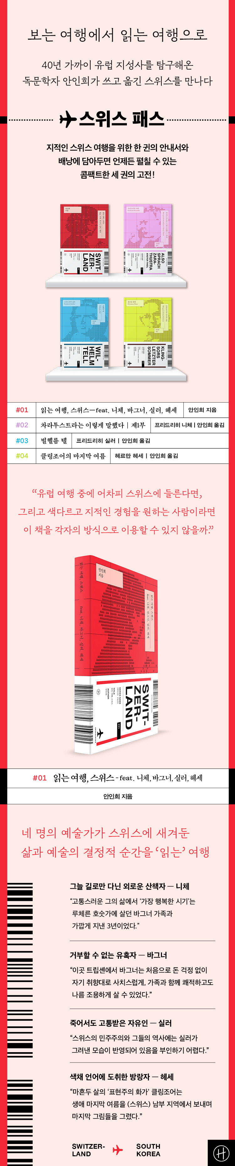 À§´ëÇÑ Ã¶ÇÐÀÚ ´Ïü´Â ¿Ö ÇÞºûÀ» ÇÇÇØ ´Ù³æÀ»±î? È÷Ʋ·¯¸¦ ¸Å·á½ÃŲ ÀÛ°î°¡ ¹Ù±×³ÊÀÇ ¿¹¼úÀû ¸¶·ÂÀº ¹«¾ùÀ̾ú³ª? ±ØÀÛ°¡ ½Ç·¯´Â ¹«¾ù ¶§¹®¿¡ Á×¾î¼ ¹«´ý±îÁö ÆÄÇìÃÄÁö¸ç °íÅë¹Þ¾Ò³ª? ¹æ¶ûÀÇ ¼Ò¼³°¡ Çì¼¼°¡ ½ºÀ§½ºÀÇ »öä¿¡ »ç·ÎÀâÈù ÀÌÀ¯´Â ¹«¾ùÀΰ¡? ÀÌ Ã¥Àº °ü±¤ ¸í¼Ò³ª È£ÅÚ, ·¹½ºÅä¶û µîÀ» ¼Ò°³ÇÏ´Â ÀüÇüÀûÀÎ °¡À̵åºÏ°ú ´Þ¸®, ¿À·¡Àü ½ºÀ§½º¿¡ ¶ß°Å¿î ÇÑ ½ÃÀýÀ» ³²°ÜµÐ °ÅÀåµéÀÇ ÈçÀû°ú ±× À̸鿡 ´ã±ä Èï¹ÌÁøÁøÇÑ À̾߱⸦ °¡°¨ ¾øÀÌ µé·ÁÁØ´Ù. ½ºÀ§½º¿¡ °ü½É ÀÖ´Â »ç¶÷À̶ó¸é ´©±¸³ª ÁöÀûÀÎ ¸¸Á·°¨°ú »ö´Ù¸¥ ½Ã¼±À» °æÇèÇÒ ¼ö ÀÖ´Â µ¶Æ¯ÇÑ ¹æ½ÄÀÇ ¡®½ºÀ§½º ¾È³»¼¡¯´Ù. ¶ÇÇÑ ½ÇÁ¦ ¿©Çà¿¡¼ ÈÞ´ëÇϰí ÇöÀå¿¡¼ °íÀüÀ» Àд ±â»ÝÀ» ¸¸³£ÇÒ ¼ö ÀÖµµ·Ï ´Ïü, ½Ç·¯, Çì¼¼ ¼¼ °ÅÀåÀÇ ½ºÀ§½º¸¦ ǰÀº ªÀº °íÀüÀ» ÀÌ Ã¥°ú ÇÔ²² Ãâ°£Çß´Ù.