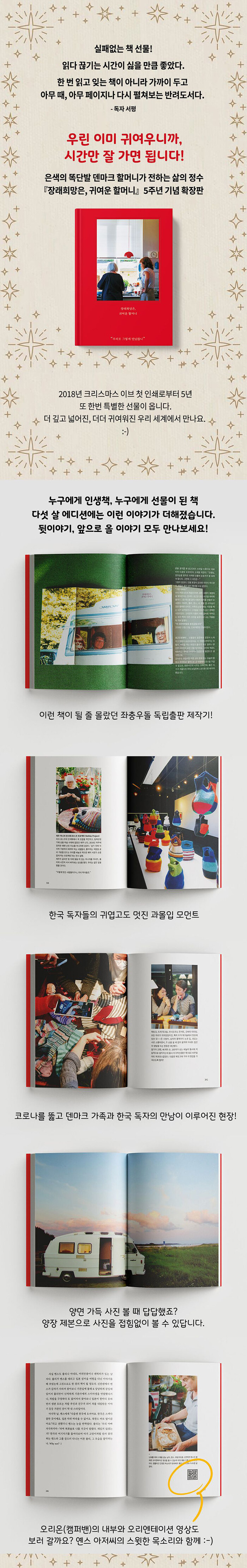 Ã¥Àº µ¶ÀÚµéÀ» ¸¸³ª¸ç ÇÑÃþ ±í°í ³Ð¾îÁ³°í, µ¶ÀÚµéÀº Ã¥ ¼Ó Àι°°ú ¹°°ÇÀ» Á÷Á¢ ¸¸³ª ´õ¿í ±Í¿©¿öÁ³´Ù. ±×¸®°í 2023³â Å©¸®½º¸¶½ºÀ̺ê, ù Àμâ 5ÁÖ³âÀ» ¸Â¾Æ Ưº°ÇÑ Ã¥ÀÌ ´Ù½Ã ž´Ù. ¹Ù·Î ¡ºÀå·¡Èñ¸ÁÀº, ±Í¿©¿î ÇÒ¸Ó´Ï¡» 5Áֳ⠱â³ä È®ÀåÆÇÀÌ´Ù. ÀÌ Ã¥À» µÑ·¯½Ñ »ç¶÷°ú ½Ã°£, °ø°£ÀÇ À̾߱⸦ ¼öÁýÇØ dz¼ºÇÏ°Ô ´ã¾Ò´Ù.