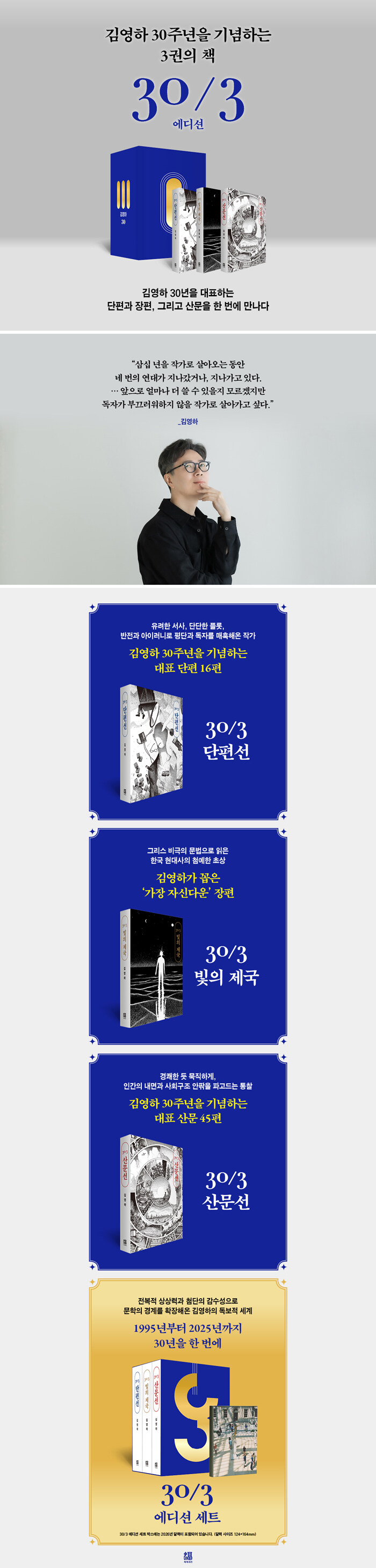 ÀÛ°¡ ±è¿µÇÏÀÇ 30³âÀ» 3±ÇÀÇ Ã¥À¸·Î ´ã¾Æ³½ ÀÌ ¼¼Æ®´Â ±×ÀÇ ÀÛǰÀ» µû¶ó Àоî¿Â ¿À·£ µ¶ÀÚµéÀº ¹°·ÐÀÌ°Å´Ï¿Í »õ·Ó°Ô ±è¿µÇÏÀÇ ÀÛǰ¼¼°è·Î ÀÔÀåÇÏ·Á´Â µ¶Àڵ鿡°Ô Ãæ½ÇÇÑ ¾È³»ÀÚ°¡ µÇ¾îÁÙ °ÍÀÌ´Ù.