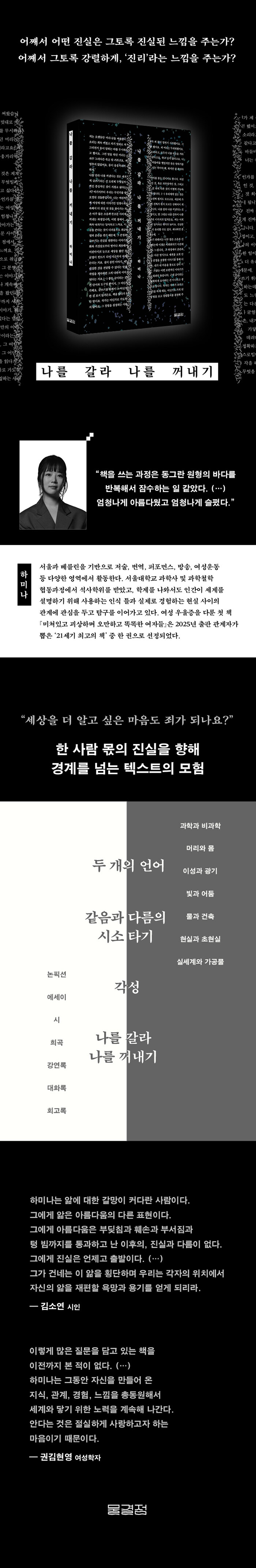 ÇϹ̳ªÀÇ ½ÅÀÛ ¡º³ª¸¦ °¥¶ó ³ª¸¦ ²¨³»±â¡»°¡ µ¿¾Æ½Ã¾ÆÀÇ ¹®ÇС¤¿¹¼ú ºê·£µå ¹°°áÁ¡ÀÇ Ã¹ Ã¥À¸·Î Ãâ°£µÇ¾ú´Ù. ¡º³ª¸¦ °¥¶ó ³ª¸¦ ²¨³»±â¡»´Â ÀúÀÚ°¡ 2021³â 1¿ùºÎÅÍ 2025³â 10¿ù±îÁö ¾´ ±ÛÀ» °¡·Á »Ì¾Æ ´ë¸éÄÉ Çϰí, Ãæµ¹½Ã۰í, ¸Â¹°¸®°Ô ÇÏ¿© ¿«¾î³½ È¥Á¾ÀÇ ÅØ½ºÆ®´Ù. À帣·Î´Â ³íÇȼÇ, ¿¡¼¼ÀÌ, ½Ã, Èñ°î, °¿¬·Ï, ´ëÈ·Ï, ȸ°í·ÏÀ» ³Ñ³ªµé°í, ÁÖÁ¦·Î´Â °úÇаú ºñ°úÇÐ, ¸Ó¸®¿Í ¸ö, À̼º°ú ±¤±â, ºû°ú ¾îµÒ, ½Ç¼¼°è¿Í °¡°ø¹°À» ³Ñ³ªµé¸ç ÀÌ Ã¥ÀÌ µµ´ÞÇÏ·Á´Â °÷Àº ¾î¶² Àå°üÀÌ ÆîÃÄÁö´Â ÀÚ¸®. ¾ÍÀÇ ÇÔÁ¤À» ³Ñ°í ¾ËÁö ¸øÇÔÀÇ µÎ·Á¿òÀ» Áå ä ¾îµÒ ¼Ó¿¡¼ ÀúÀÚ°¡ ¸¶ÁÖÇÑ Áø½ÇÀÇ Ç³±¤Àº ¡°¾öû³ª°Ô ¾Æ¸§´Ù¿ü°í ¾öû³ª°Ô ½½Æâ´Ù¡±.