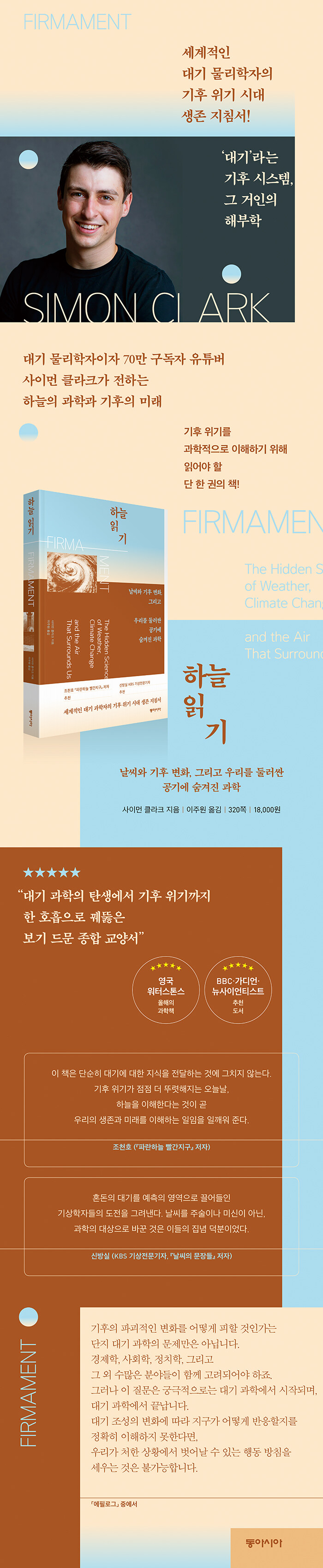 ´ë±â ¹°¸®ÇÐÀÚÀÌÀÚ 70¸¸ ±¸µ¶ÀÚ¸¦ º¸À¯ÇÑ À¯Æ©ºê ä³ÎÀ» ¿î¿µÇÏ¸ç °úÇÐ Ä¿¹Â´ÏÄÉÀÌÅͷεµ Ȱµ¿Çϰí ÀÖ´Â »çÀÌ¸Õ Å¬¶óÅ©(Simon Clark)ÀÇ ¡ºÇÏ´Ã Àбâ:³¯¾¾¿Í ±âÈÄ º¯È, ±×¸®°í ¿ì¸®¸¦ µÑ·¯½Ñ °ø±â¿¡ ¼û°ÜÁø °úÇС»Àº ±âÈÄ À§±â ½Ã´ë¿¡ ¿ì¸®°¡ ²À ¾Ë¾Æ¾ß ÇÒ ¡®´ë±â(ÓÞѨ)¡¯¿¡ ´ëÇØ ½±°í Àç¹ÌÀÖ°Ô Ç®¾î³½ ±³¾ç °úÇм´Ù. Ã¥Àº ±âÈÄ À§±â¿¡ ´ëÇÑ ¸íÈ®ÇÑ µ¥ÀÌÅ͸¦ Á¦½ÃÇÏ¸ç °úÇÐÀûÀ¸·Î ÇØ¼³ÇÏ´Â ÇÑÆí, »ý¸íÀ» °¡´ÉÇÏ°Ô ÇÏ´Â ±âÈÄ ½Ã½ºÅÛÀÇ ¸é¸éÀ» ÃÑüÀûÀÎ ½Ã°¢À¸·Î Èï¹ÌÁøÁøÇÏ°Ô ¼³¸íÇÑ´Ù.