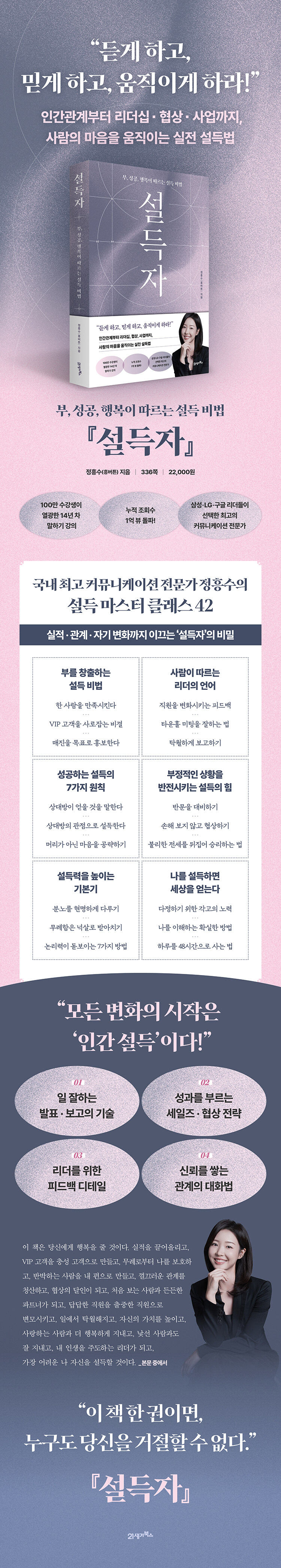 ¸ðµç ¼ºÃëÀÇ ½ÃÀÛ°ú ³¡¿¡´Â ¡®¼³µæ¡¯ÀÌ ÀÖ´Ù. º¸°í¿Í Çǵå¹é, ¼¼ÀÏÁî¿Í Çù»ó, ȸÀÇ¿Í ´ëȱîÁö ¸»·Î ÀÏÇϰí, °ü°è¸¦ ¸Î´Â »ç¶÷À̶ó¸é ´©±¸³ª ¼³µæÀÇ ¼ø°£À» ¸Â´Â´Ù. ¡º¼³µæÀÚ¡»´Â Ä¿¹Â´ÏÄÉÀÌ¼Ç Àü¹®°¡ Á¤Èï¼ö°¡ ÇöÀå¿¡¼ Á÷Á¢ °ËÁõÇÑ ³ëÇÏ¿ì·Î ±â¾÷ ¸®´õµéÀÌ ¸ÕÀú ãÀº ¡®¼³µæÀÇ ±â¼ú¡¯°ú ¡®½Å·ÚÀÇ ±â¼ú¡¯À» Çѵ¥ ¸ðÀº Ã¥ÀÌ´Ù. »ó´ë¸¦ À̱â±âº¸´Ù ÇÔ²² ¼ºÀåÇÏ´Â ¼³µæ, °¨Á¤º¸´Ù ½Å·Ú·Î °ü°è¸¦ ¼¼¿ì´Â ¼³µæ, ¸»ÀÇ Åµµ¸¦ ¹Ù²ã ¼º°ú¿Í ÇູÀ» µ¿½Ã¿¡ ¾ò´Â ¼³µæÀÇ ¿ø¸®¸¦ Á¦½ÃÇÑ´Ù. ¼º°ú¸¦ ³»°í, °ü°è¸¦ Áö۸ç, ¿øÇÏ´Â ÀλýÀ» »ì°í ½ÍÀº À̵鿡°Ô Çö¸íÇÏ°Ô ¸»ÇÏ´Â ¹ýÀ» ¾Ë·ÁÁÖ´Â ÃÖ°ÀÇ ¼³µæ Áöħ¼°¡ µÇ¾îÁÙ °ÍÀÌ´Ù.