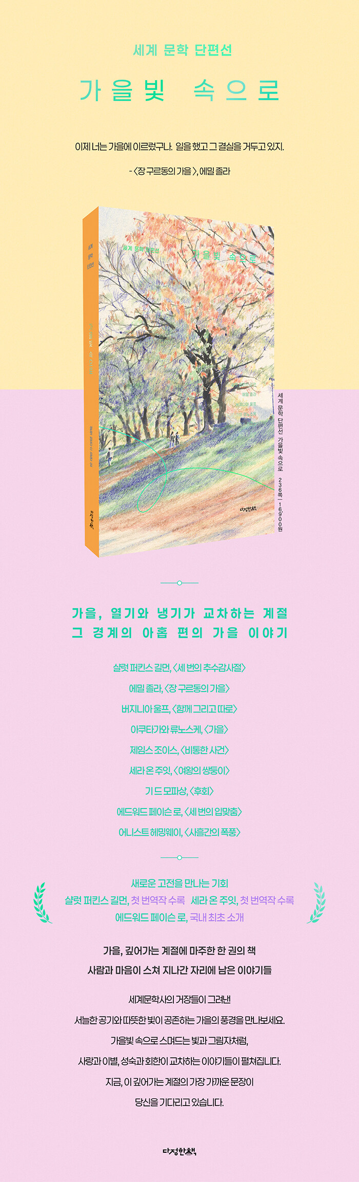 ¼¼ ¹øÀÇ Ãß¼ö°¨»çÀýÀ» °ÅÄ¡¸ç ÀÚ¸³°ú Á¸¾öÀ» ã¾Æ°¡´Â ÇÑ ¿©¼ºÀÇ »îÀ» ±×¸° ¼£·µ ÆÛŲ½º ±æ¸ÕÀÇ ¡´¼¼ ¹øÀÇ Ãß¼ö°¨»çÀý¡µ, ÇÁ·Î¹æ½º ³óºÎ°¡ dz¿ä·Î¿î ¼öÈ® ¼Ó¿¡¼ ¸ÂÀÌÇÏ´Â »ý¸íÀÇ Åº»ý°ú ¼Ò¸ê,) ¿¡¹Ð Á¹¶óÀÇ ±¹³» ù ¹ø¿ªÀÛ ¡´Àå ±¸¸£µ¿ÀÇ °¡À»¡µ, »ç±³°è »ç¶÷µéÀÇ ¸»°ú ħ¹¬ »çÀÌ, ±× ¹Ì¹¦ÇÑ °£±ØÀ» ºñÃá ¹öÁö´Ï¾Æ ¿ïÇÁÀÇ ¡´ÇÔ²² ±×¸®°í µû·Î¡µ, ÀڸŠ»çÀÌÀÇ »ç¶û°ú Èñ»ý, ¿ì¾Ö¿Í ÁúÅõ »çÀÌÀÇ ¹Ì¹¦ÇÑ ¿Âµµ¸¦ ¼Á¤ÀûÀ¸·Î ±×·Á³½ ¾ÆÄퟰ¡¿Í ·ù³ë½ºÄÉÀÇ ±¹³» ù ¹ø¿ªÀÛ ¡´°¡À»¡µ, ÇѶ§ ¸¶À½À» ³ª´« ¿©ÀÎÀÇ Á×À½À¸·Î ÀÎÇØ °í¸³µÈ ÀÚ½ÅÀ» ¸¶ÁÖÇÏ´Â Á¦ÀÓ½º Á¶À̽ºÀÇ ¡´ºñÅëÇÑ »ç°Ç¡µ, ÀÚ½ÅÀ» ¿©¿ÕÀÇ ½ÖµÕÀ̶ó ¹Ï´Â ÇÑ ³ëºÎÀÎÀÇ Ç°°Ý ÀÖ´Â »îÀ» ±×¸° ¼¼¶ó ¿Â ÁÖÀÕÀÇ ¡´¿©¿ÕÀÇ ½ÖµÕÀÌ¡µ, ÀþÀº ½ÃÀý Àڽſ¡°Ô ã¾Æ¿Â »ç¶ûÀ» ºÙÀâÁö ¸øÇÑ ÇÑ ³²ÀÚÀÇ ±íÀº ȸÇÑ, ¸ðÆÄ»óÀÇ ¡´ÈÄȸ¡µ, ¿ì¿¬ÇÑ ÀÔ¸ÂÃã¿¡¼ ½ÃÀÛµÈ µÎ ³²³àÀÇ ¿ÀÇØ¿Í °¥µî, ÈÇØÀÇ °úÁ¤À» ±×¸° ¿¡µå¿öµå ÆäÀ̽¼ ·ÎÀÇ ¡´¼¼ ¹øÀÇ ÀÔ¸ÂÃ㡵, ö¾ø´Â µÎ ³²ÀÚ°¡ ¼úÀÜÀ» ±â¿ïÀÌ¸ç ½ñ¾Æ³»´Â ³ÌµÎ¸®¸¦ ´ãÀº Çì¹Ö¿þÀÌÀÇ ¡´»çÈê°£ÀÇ ÆøÇ³¡µ±îÁö, ÀÛǰµéÀº Àú¸¶´ÙÀÇ °³¼º°ú °áÀ» Áö´Ñ ä ¡®°¡À»¡¯À̶ó´Â ÇϳªÀÇ °èÀýÀ» ´Ù¾çÇÑ Á¤¼¿Í ¼»ç·Î ±×·Á³½´Ù. ÀÌ Ã¥À» ÆîÄ¡´Â ¼ø°£, °¡À»ºû ¼ÓÀ¸·Î ½º¸çµå´Â À̾߱âµéÀÌ ´ç½ÅÀÇ ¸¶À½À» Á¶¿ëÈ÷ ¹°µéÀδÙ. ªÁö¸¸ ¹Ðµµ ³ôÀº ¼»ç ¼Ó¿¡ ±êµç °¨Á¤ÀÇ ¿ï¸²ÀÌ ±í¾î°¡´Â °èÀýÀÇ ³¡¿¡¼ ¿À·¡µµ·Ï ³²À» °ÍÀÌ´Ù.