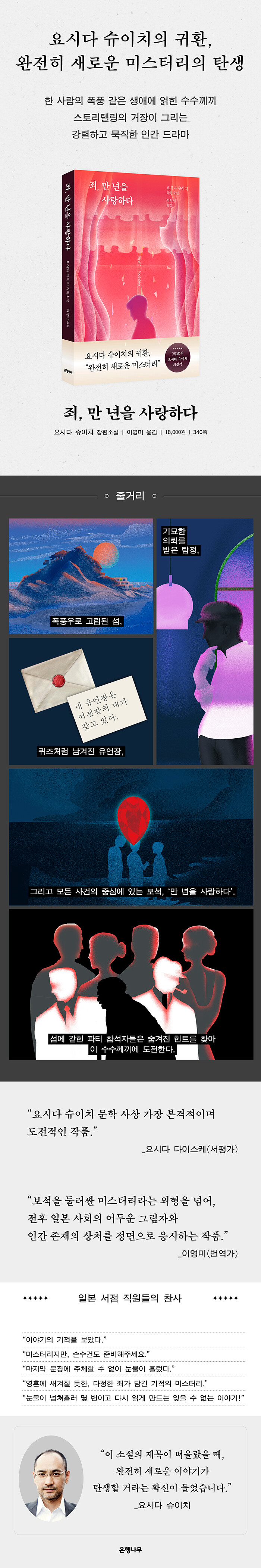 Áö±Ý ÀϺ»¿¡¼ °¡Àå »ç¶û¹Þ´Â ¼Ò¼³°¡, ¿ä½Ã´Ù ½´ÀÌÄ¡ÀÇ ÃÖ½ÅÀÛ ¡¶ÁË, ¸¸ ³âÀ» »ç¶ûÇÏ´Ù¡·°¡ ÀºÇ೪¹«ÃâÆÇ»ç¿¡¼ Ãâ°£µÇ¾ú´Ù. ¡°Àΰ£=À̾߱⡱¶ó´Â ½Å³äÀ¸·Î ´Ù¾çÇÑ À帣¸¦ ÀÚÀ¯·Ó°Ô ³Ñ³ªµé¸ç µ¶ÀÚµéÀÇ ²ÙÁØÇÑ ÁöÁö¸¦ ¹Þ¾Æ¿Â ÀúÀÚ°¡ À̹ø¿¡´Â ÆøÇ³¿ì°¡ ¸ô¾ÆÄ¡´Â ¼¶À» ¹«´ë·Î ÇÑ ¹Ì½ºÅ͸®¸¦ ¼±º¸ÀδÙ. °í¸³µÈ ¼¶¿¡¼ ¿¸° ÆÄƼ, ±â¹¦ÇÑ ÀÇ·Ú¸¦ ¹ÞÀº ŽÁ¤, Á¤Ã¼ºÒ¸íÀÇ º¸¼® µî Á¤Åë Ã߸®¼Ò¼³ÀÇ ¿ä¼Ò¸¦ Ãæ½ÇÈ÷ °®Ãá À̾߱â´Â µîÀåÀι°µé°ú ÇÔ²² ¼ö¼ö²²³¢¸¦ Ç®¾î°¡´Â µíÇÑ ¸ôÀÔ°¨À» ¼±»çÇϸç, ÀÛ°¡ ƯÀ¯ÀÇ »çȸÀû ½Ã¼±ÀÌ ´õÇØÁ® ¿¹»óÄ¡ ¸øÇÑ µ¶Ã¢ÀûÀÎ °á¸»·Î ³ª¾Æ°£´Ù. ¡°Áö±Ý±îÁö¿Í´Â ´Ù¸¥, ¿ÏÀüÈ÷ »õ·Î¿î À̾߱⸦ ¾²°í ½Í¾ú´Ù¡±¶ó´Â °ÍÀÌ ÁýÇÊÀÇ Ãâ¹ßÁ¡ÀÎ ¸¸Å, ¼ö¼ö²²³¢ÀÇ ³¡¿¡¼ µ¶ÀÚ´Â ÀØÀ» ¼ö ¾ø´Â ÇÑ »ý¾Ö¿Í ½Ã´ë¿¡ »õ°ÜÁø ¾ÆÇİú »ç¶ûÀ» ¸¶ÁÖÇÏ°Ô µÈ´Ù. ³ë·ÃÇÑ ½ºÅ丮ÅÚ¸µ °ÅÀ常ÀÌ º¸¿©ÁÙ ¼ö ÀÖ´Â ½Å¼±ÇÑ ½Ãµµ¿Í ±íÀ̰¡ µ¸º¸ÀÌ´Â ¹Ì½ºÅ͸® ¼Ò¼³.