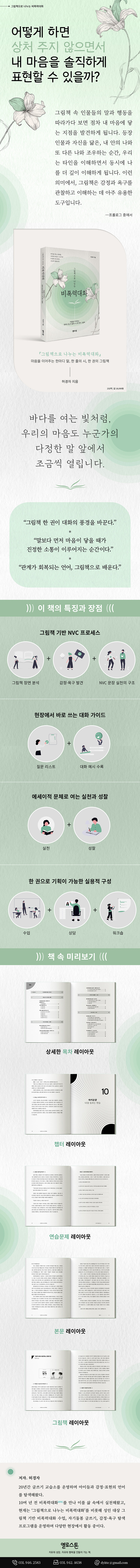 ¡¶±×¸²Ã¥À¸·Î ³ª´©´Â ºñÆø·Â´ëÈ¡·ÀÇ °¡Àå Å« ÀåÁ¡Àº ±×¸²Ã¥ 14±ÇÀ» Åä´ë·Î NVC ÇÙ½É ¿ä¼Ò¸¦ ½ÇÁ¦ »î°ú ±³À°¡¤»ó´ã ÇöÀå¿¡¼ ¾î¶»°Ô Àû¿ëÇÒ ¼ö ÀÖ´ÂÁö¸¦ ¸Å¿ì ±¸Ã¼ÀûÀ̸鼵µ µû¶æÇÑ ¾ð¾î·Î Ç®¾î³½ Á¡ÀÌ´Ù. ¿¹¸¦ µé¾î ¡¶ÇÏ·ç°Å¸®¡·´Â ¡®µû¶æÇÑ ½Ã¼±À¸·Î ¹Ù¶óº¸´Â °üÂû¡¯À», ¡¶°¨Á¤ È£ÅÚ¡·Àº ¡®´Ù¾çÇÑ °¨Á¤À» ¹Þ¾ÆµéÀÌ´Â ¿¬½À¡¯À», ¡¶ÇÏ´ÃÀ» ³ª´Â »çÀÚ¡·´Â ¡®¼ÖÁ÷ÇÏ°Ô ºÎŹÇÏ´Â ¿ë±â¡¯¸¦, ¡¶°õ¾¾ÀÇ ÀÇÀÚ¡·´Â ¡®Ä£ÀýÇϸ鼵µ ºÐ¸íÇÑ °æ°èÀÇ Ç¥Çö¡¯À» º¸¿©ÁØ´Ù. ¶ÇÇÑ ¡¶¼ÒÇǰ¡ ȳª¸é Á¤¸» Á¤¸» ȳª¸é¡·Ã³·³ ºÎÁ¤ÀûÀÎ °¨Á¤ Ç¥ÇöÀ» ´Ù·é ±×¸²Ã¥Àº ºÐ³ë¸¦ ¾ï¾ÐÇϰųª Æø¹ß½ÃŰ´Â ¹æ½ÄÀÌ ¾Æ´Ï¶ó, ±× ¼Ó¿¡ ¼ûÀº ¿å±¸¸¦ µé¿©´Ùº¸´Â NVCÀû Á¢±ÙÀ» »õ·Ó°Ô Á¦½ÃÇÑ´Ù. ´õºÒ¾î ¡¶³» ¸¶À½¿¡ ÆÄµµ°¡ Ä¥ ¶§¡·¿Í ¡¶±¦Âú¾Æ, ³ªÀÇ µÎ²¨ºñ¾ß¡·´Â ÀÚ±â°ø°¨ÀÇ ¿©·¯ ÃþÀ§¸¦ ±íÀÌ ÀÖ°Ô Å½»öÇϵµ·Ï ¾È³»ÇÑ´Ù. ´ÙÀ½Àº ÀÌ Ã¥¿¡¼ ´Ù·ç°í ÀÖ´Â ºñÆø·Â´ëÈÀÇ ÇÙ½É ¿ä¼Ò¸¦ ´ãÀº ÃÑ 14±ÇÀÇ ±×¸²Ã¥ÀÌ´Ù.